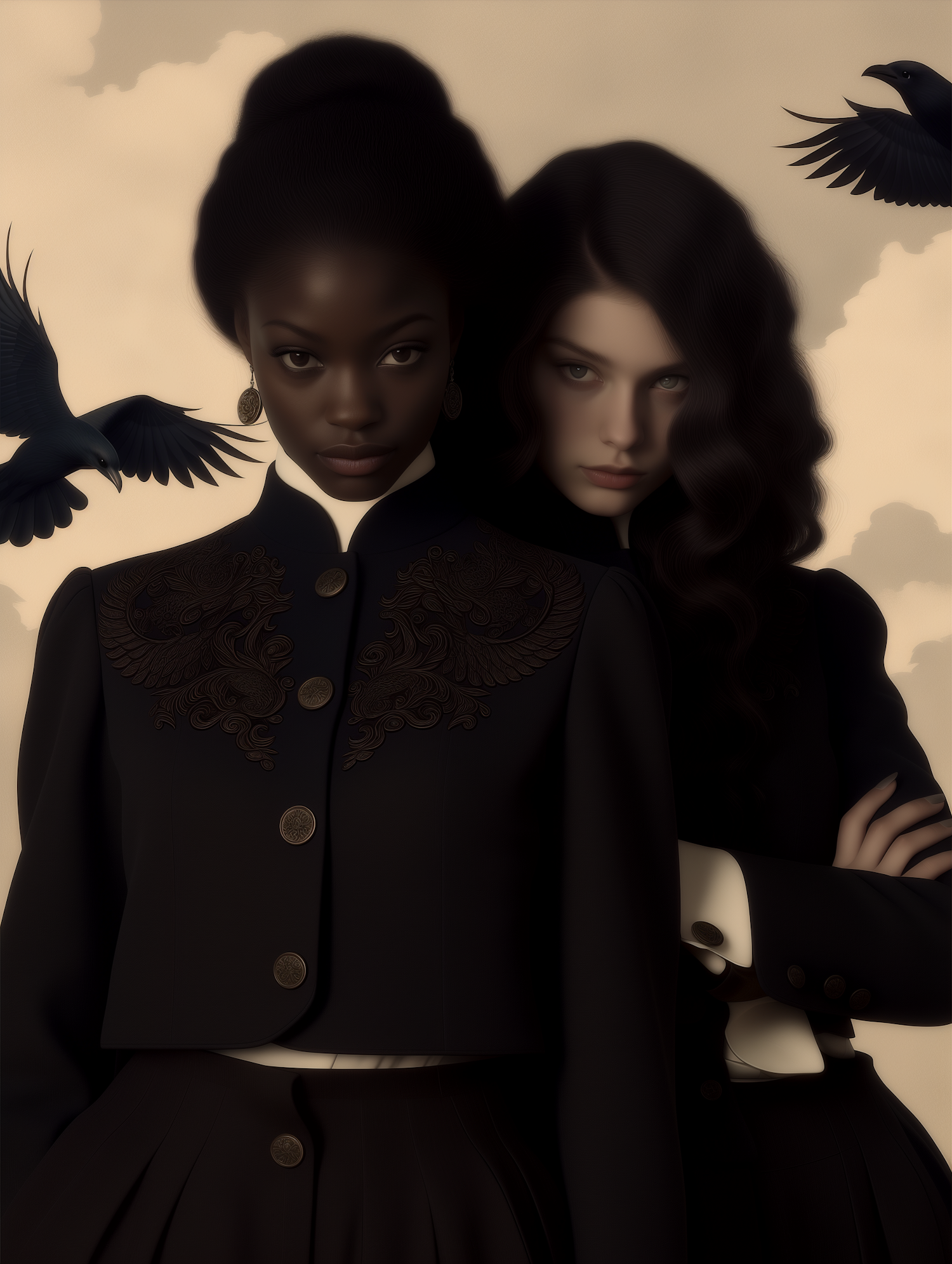 A stylized portrait of two women in dark attire with a muted sky and birds in the background, evoking a mysterious and elegant atmosphere.