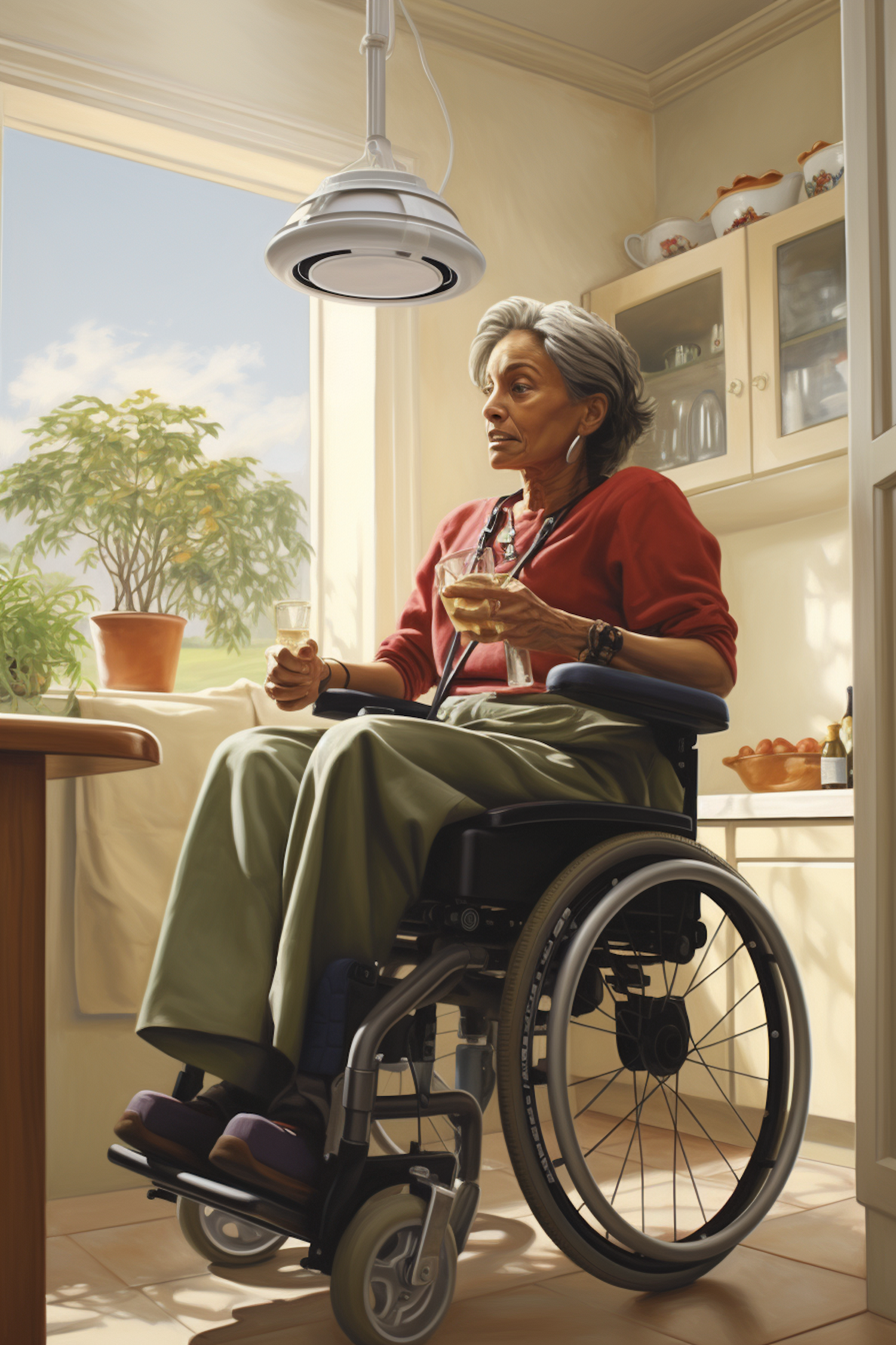 Elderly woman in a wheelchair, holding glasses, in a sunlit kitchen with plants and cozy decor.