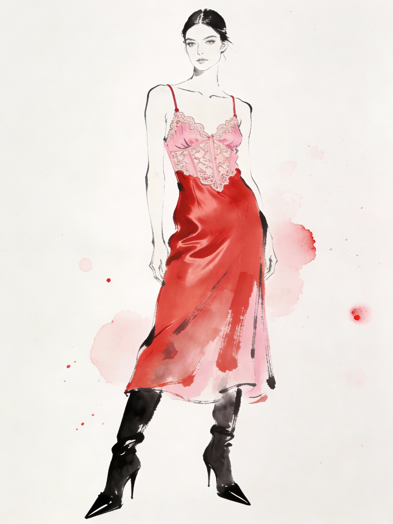 An abstract and minimal ink sketch of a fashion model with a red satin and pink lace camisole and midi slip skirt, black stiletto pointed-toe boots