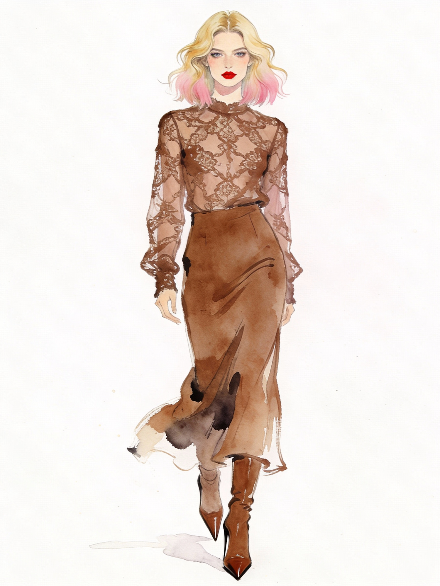 Fashion illustration of a model in a lace top, brown skirt, and boots, with blonde hair and pink tips, showcasing elegance and style.