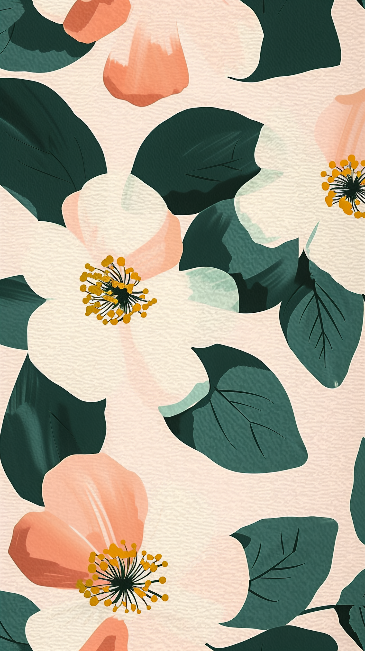 Stylized floral illustration with white and peach flowers, deep green leaves, and yellow accents on a beige background. Perfect for decor.