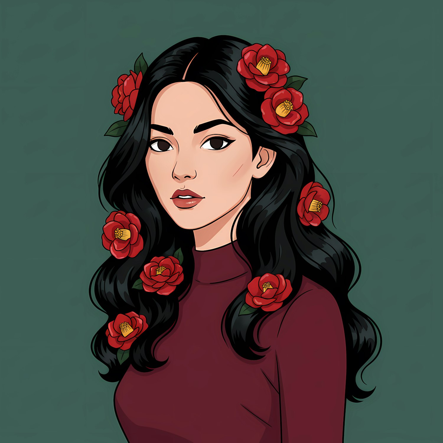 Illustration of a woman with black hair adorned with red flowers, wearing a maroon top against a green background.