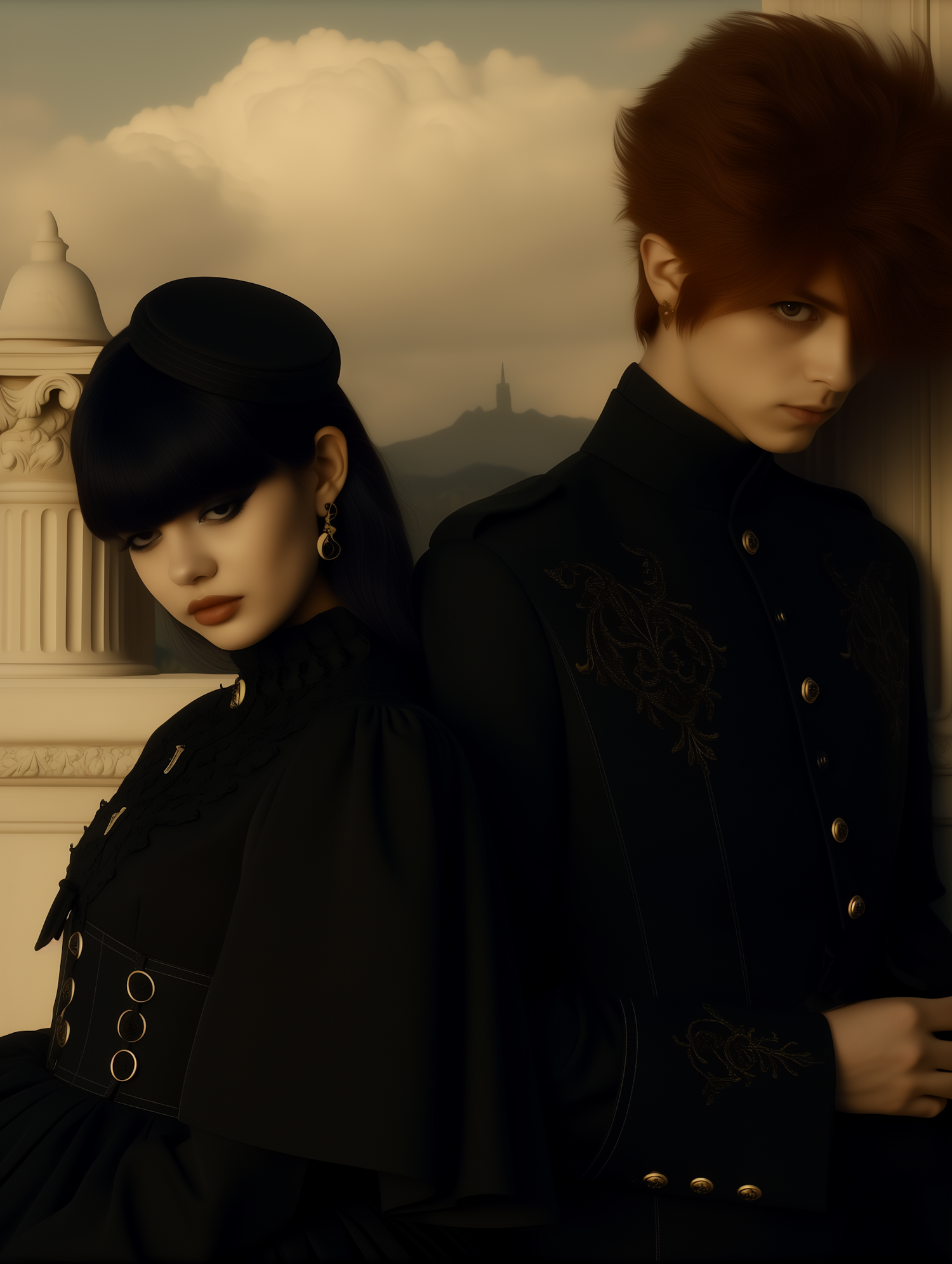 Two individuals in dark, elegant attire stand against a classical backdrop with a distant tower, exuding a formal and introspective mood.
