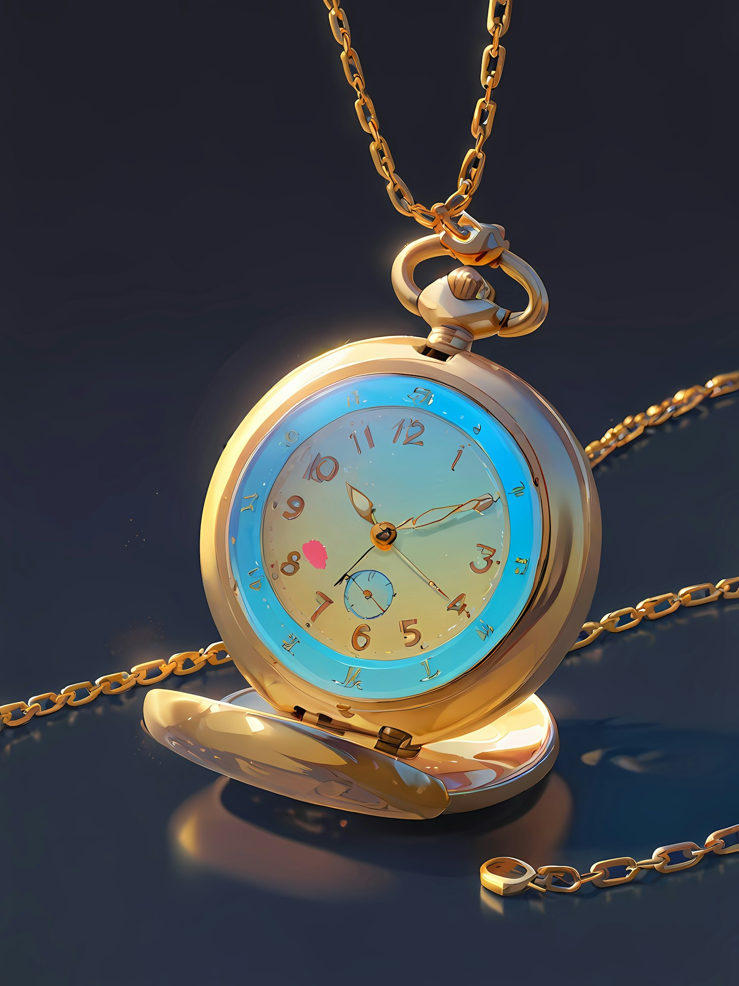 Elegant gold pocket watch with a blue and gold gradient dial, intricate details, and a delicate chain, set against a dark background.