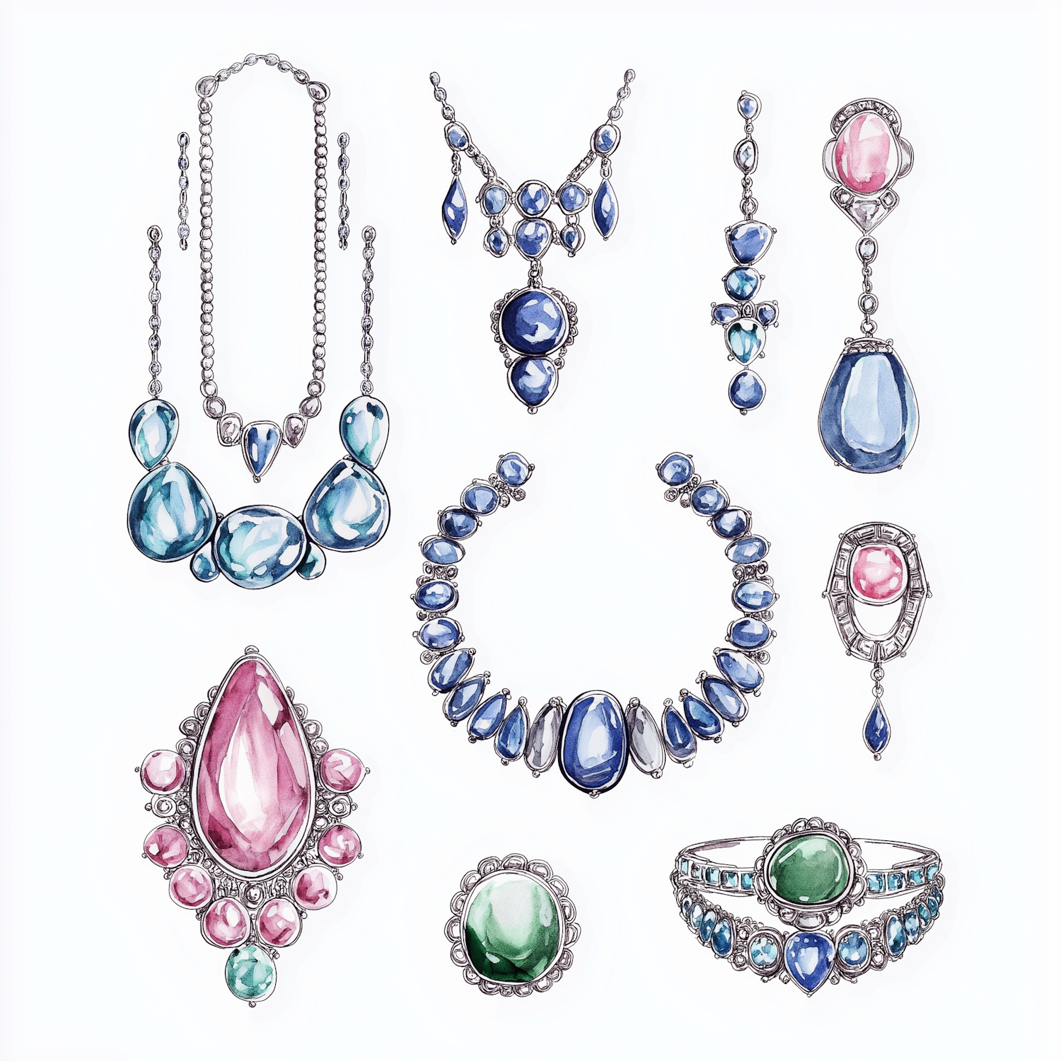 Elegant jewelry collection with blue, pink, and green gemstones in silver settings. Includes necklaces, earrings, rings, and bracelets.