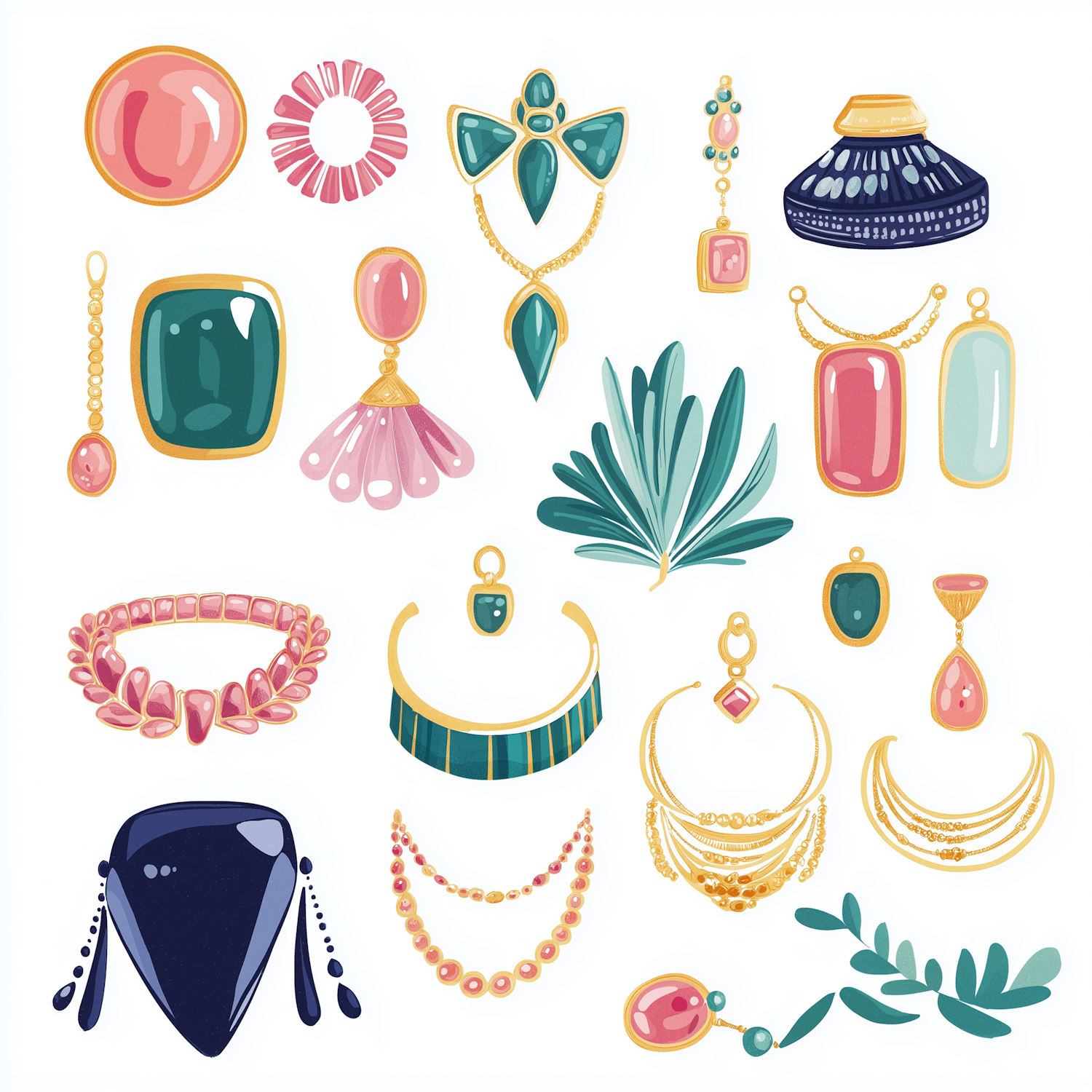 Colorful illustration of jewelry and botanical elements, featuring pink, green, and gold tones with intricate designs and modern flair.