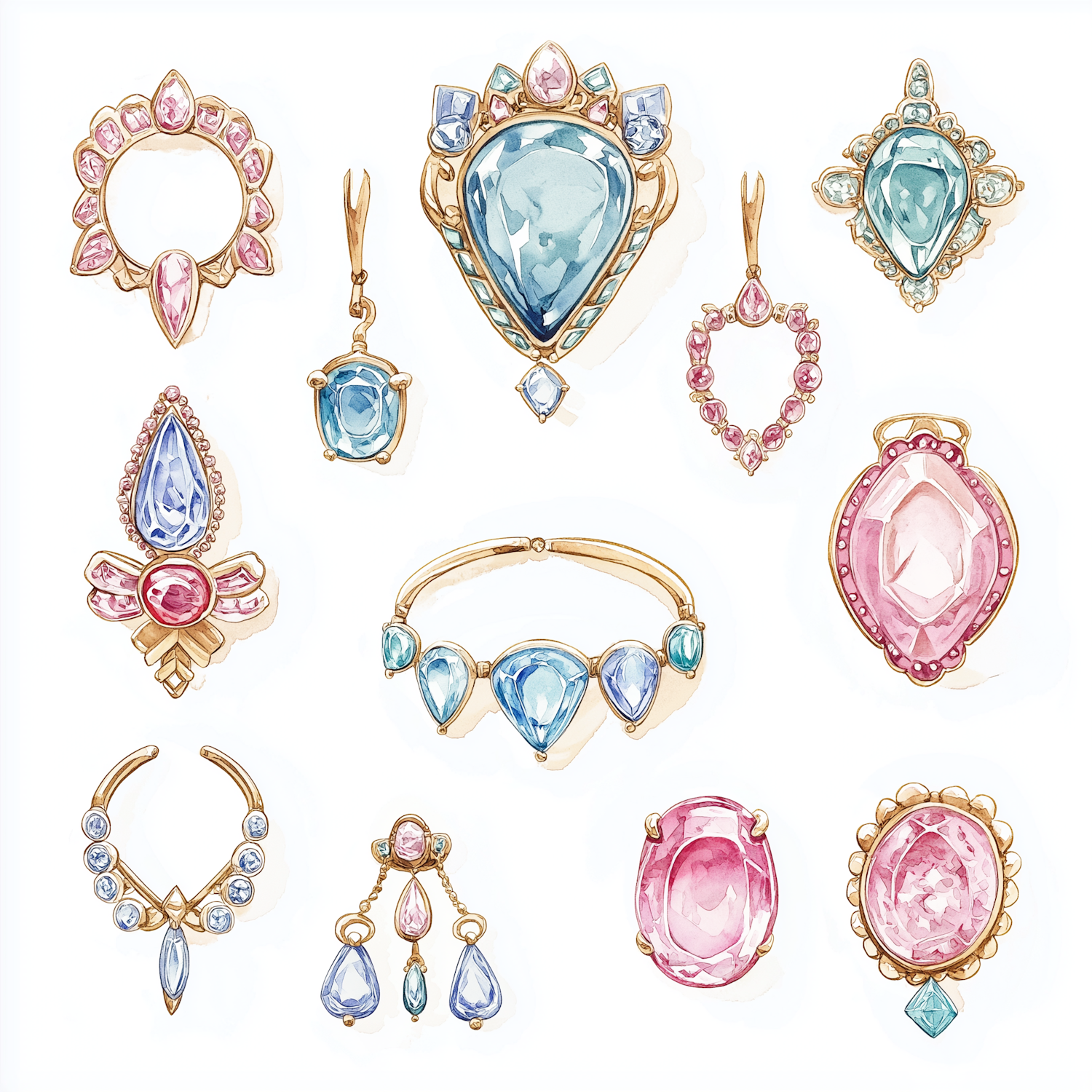 Elegant gold jewelry with pink and blue gemstones in teardrop and oval shapes. Rings, pendants, and bracelets on a clean white background.