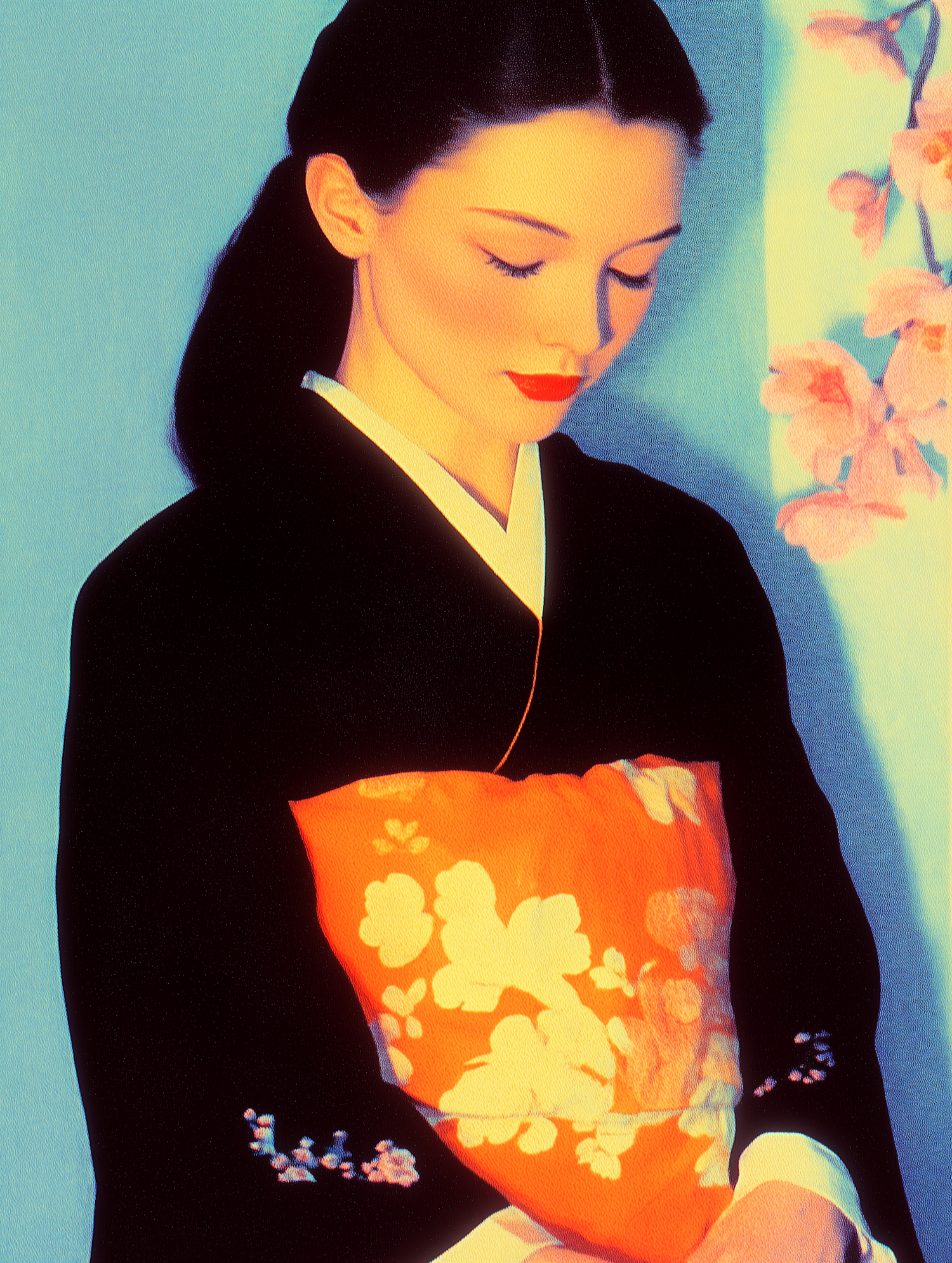 A serene woman in a black kimono with a vibrant orange obi, set against a blue background with cherry blossoms. A blend of tradition and art.
