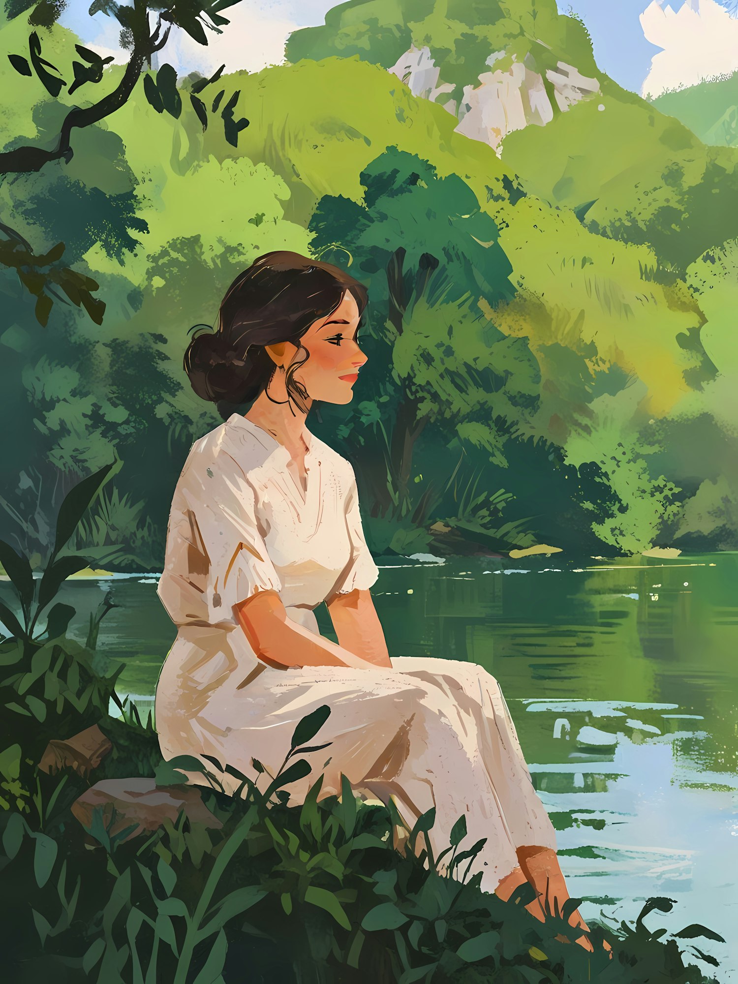 Illustration of a woman in a white dress sitting by a green, serene lake surrounded by nature under a soft, ambient light.