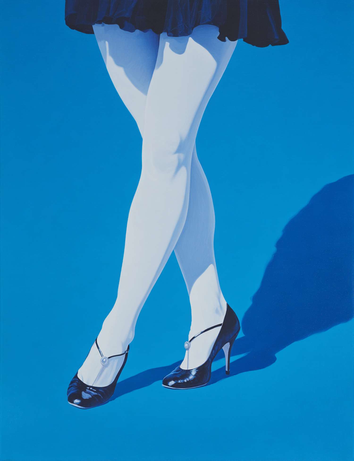 Artistic depiction of legs with white tights, black heels, and a dark skirt, set against a vivid blue background.