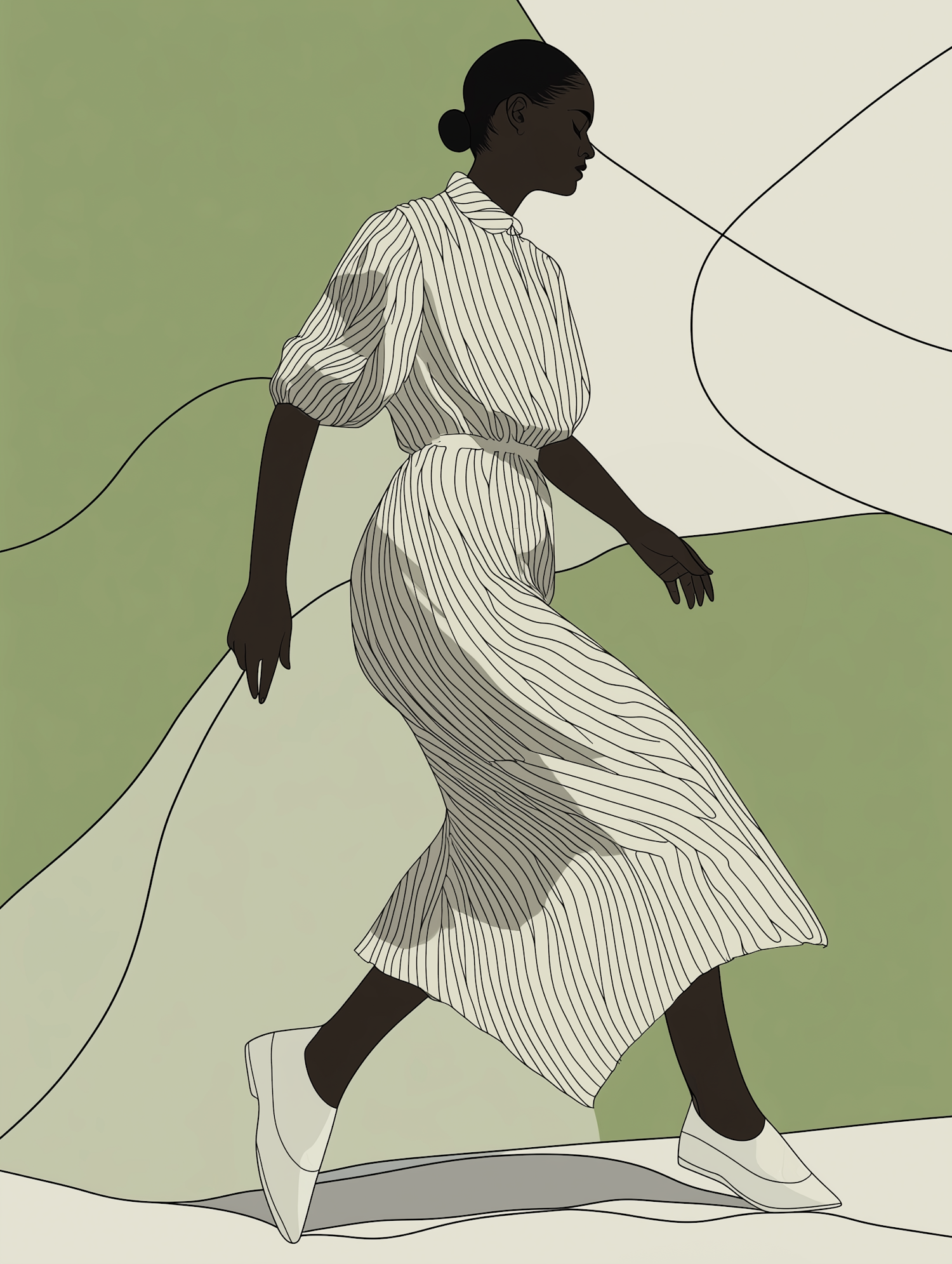 Stylized illustration of a woman in a striped dress walking gracefully against a minimalist green and cream background.