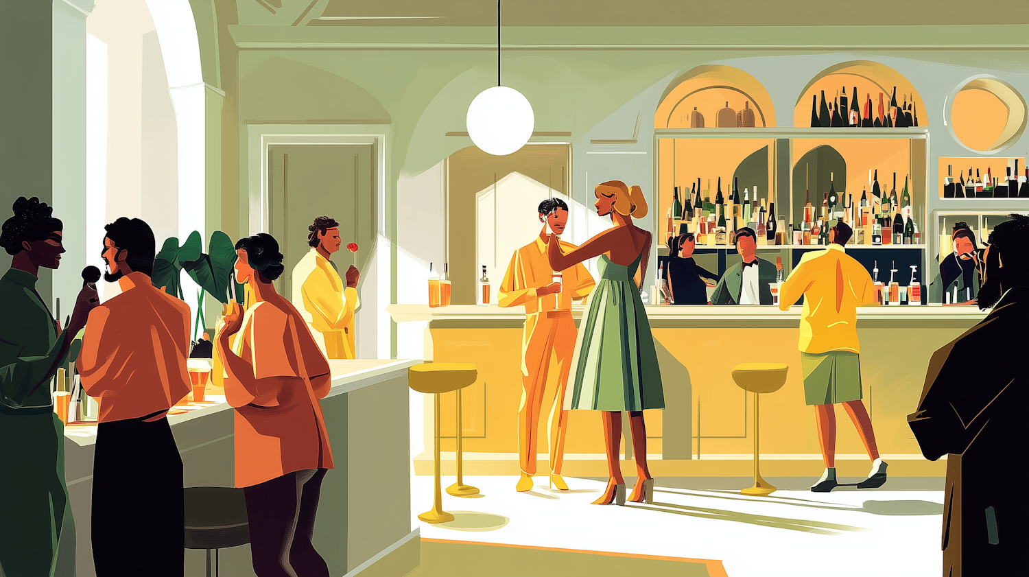 Stylish bar scene with diverse people socializing, vibrant colors, and a modern, elegant atmosphere.