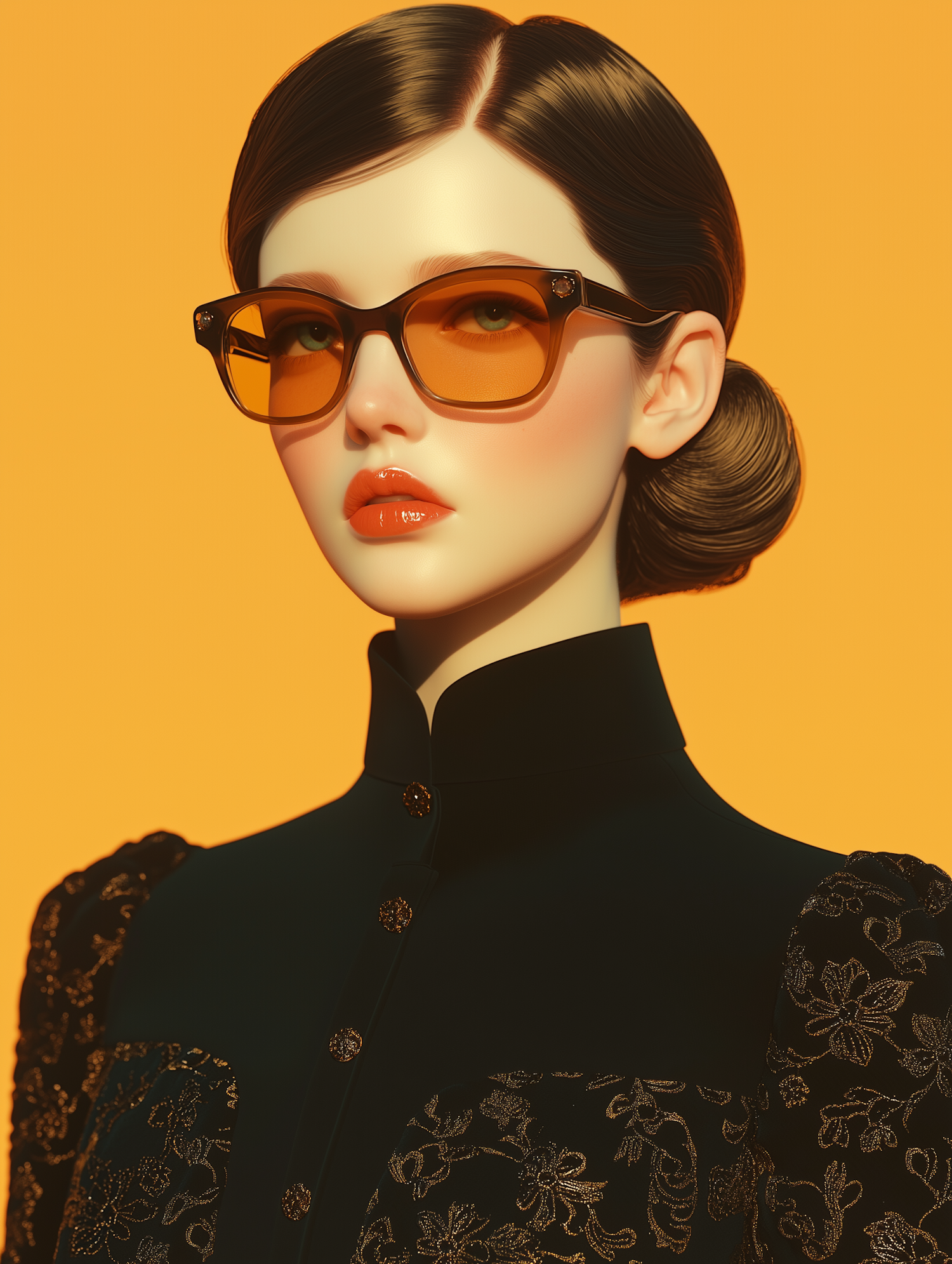 Stylized portrait of a woman in orange-tinted glasses and a black embroidered outfit against a vibrant orange background.