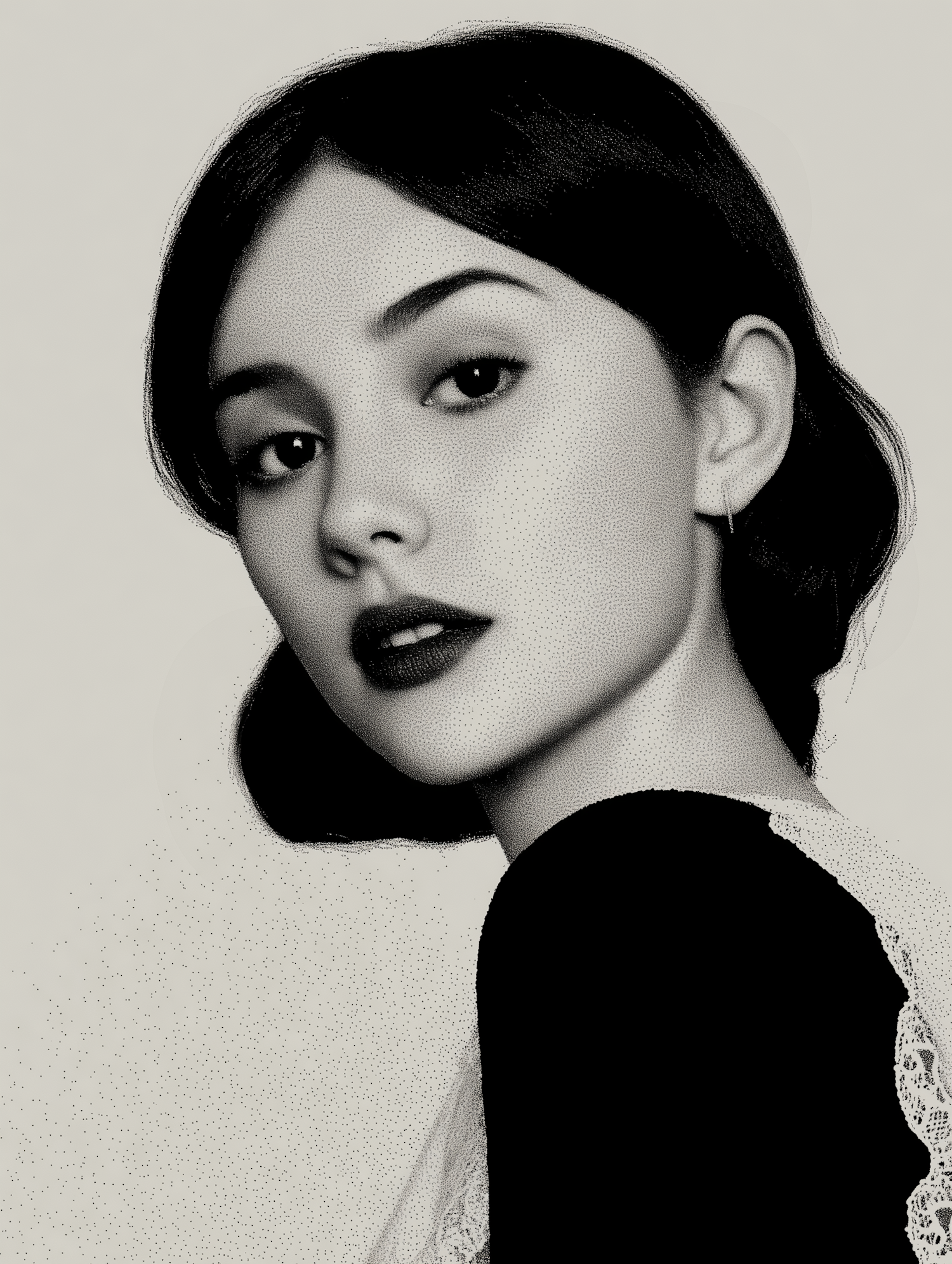 Monochromatic portrait of a young woman with dark hair, fair skin, and elegant lace details in her attire.