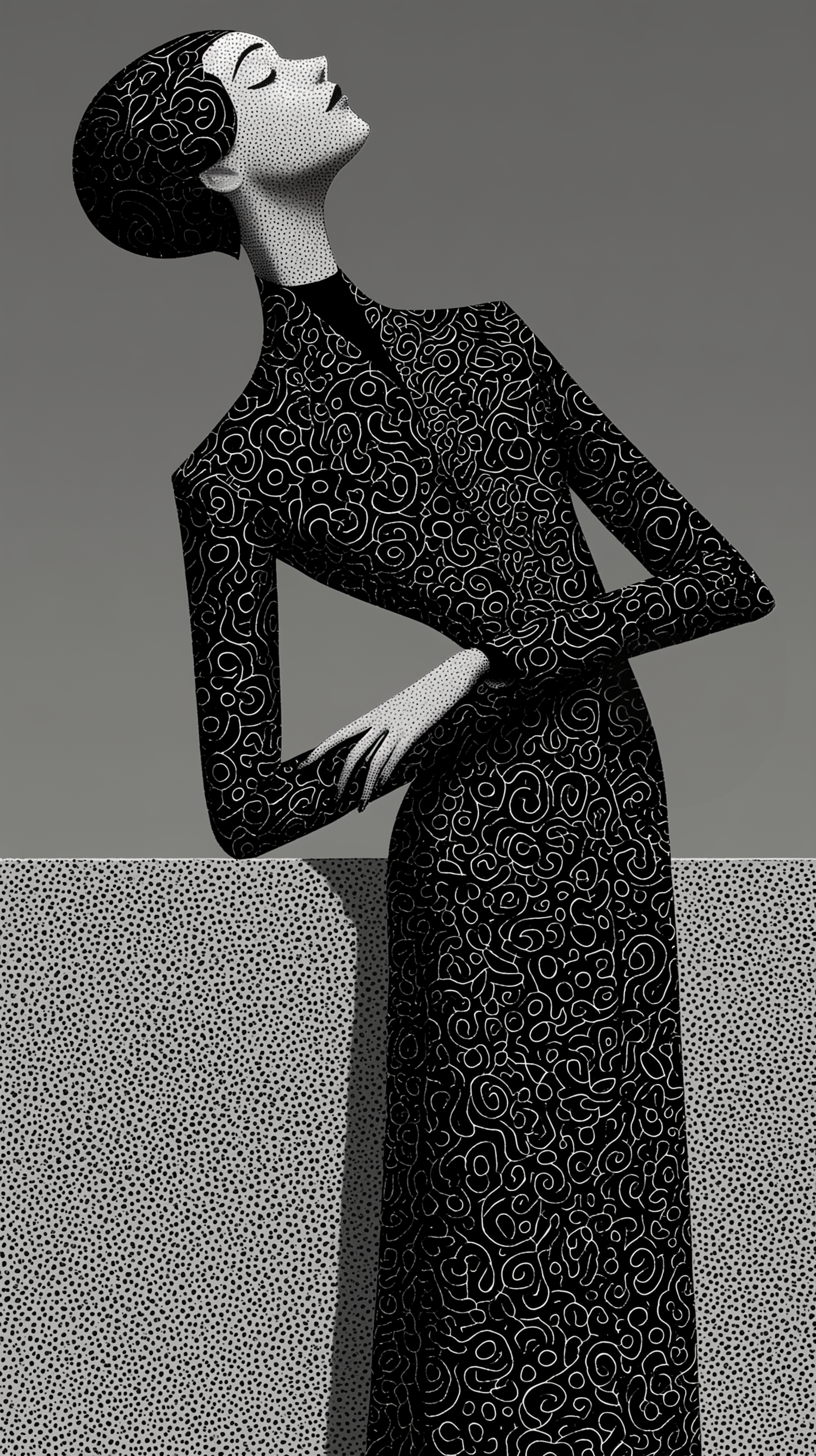 Stylized illustration of a figure in a patterned black outfit with intricate white designs, set against a textured gray background.