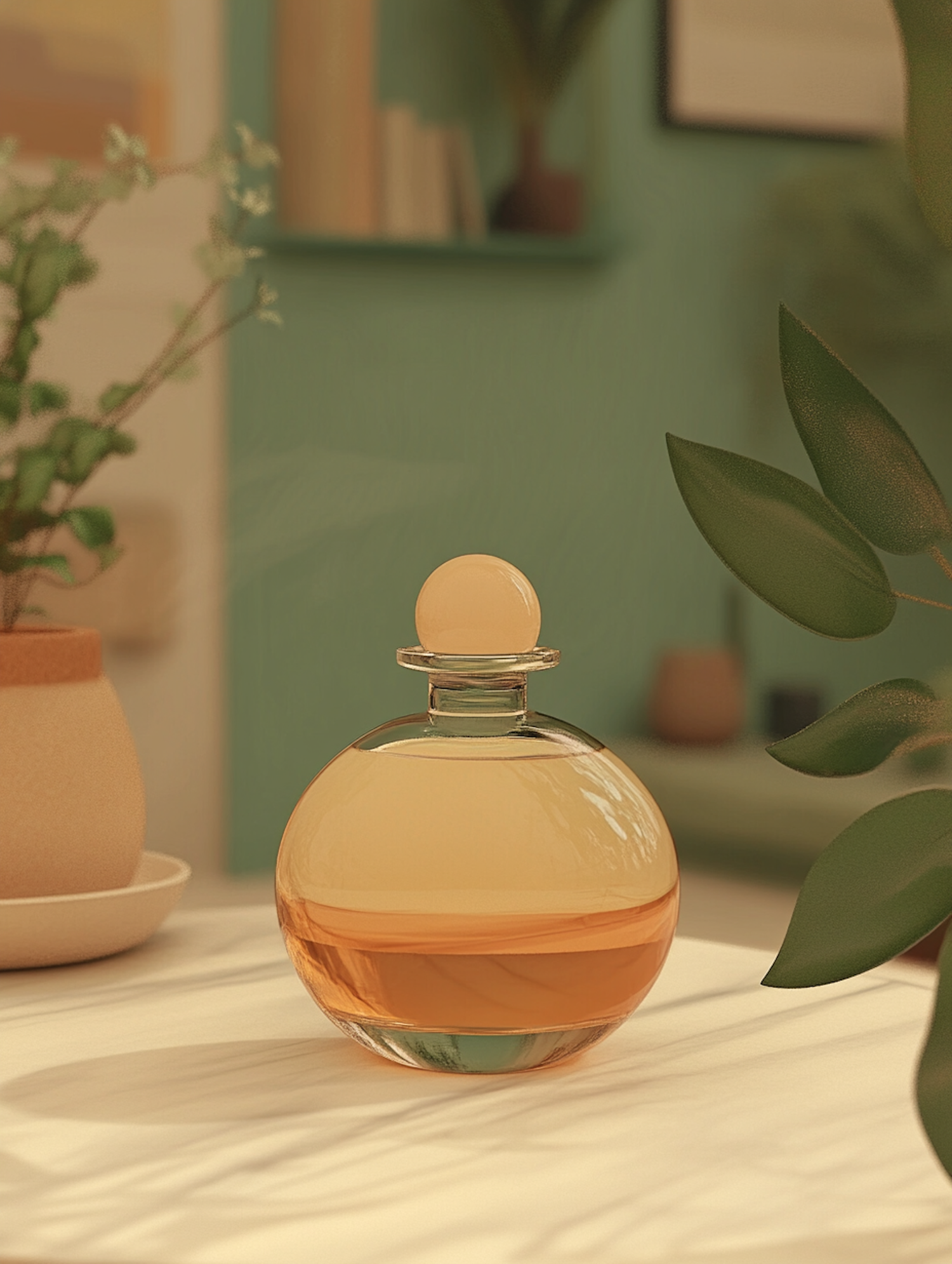 Elegant round perfume bottle with golden liquid on a table, surrounded by plants and soft natural light in a cozy interior setting.