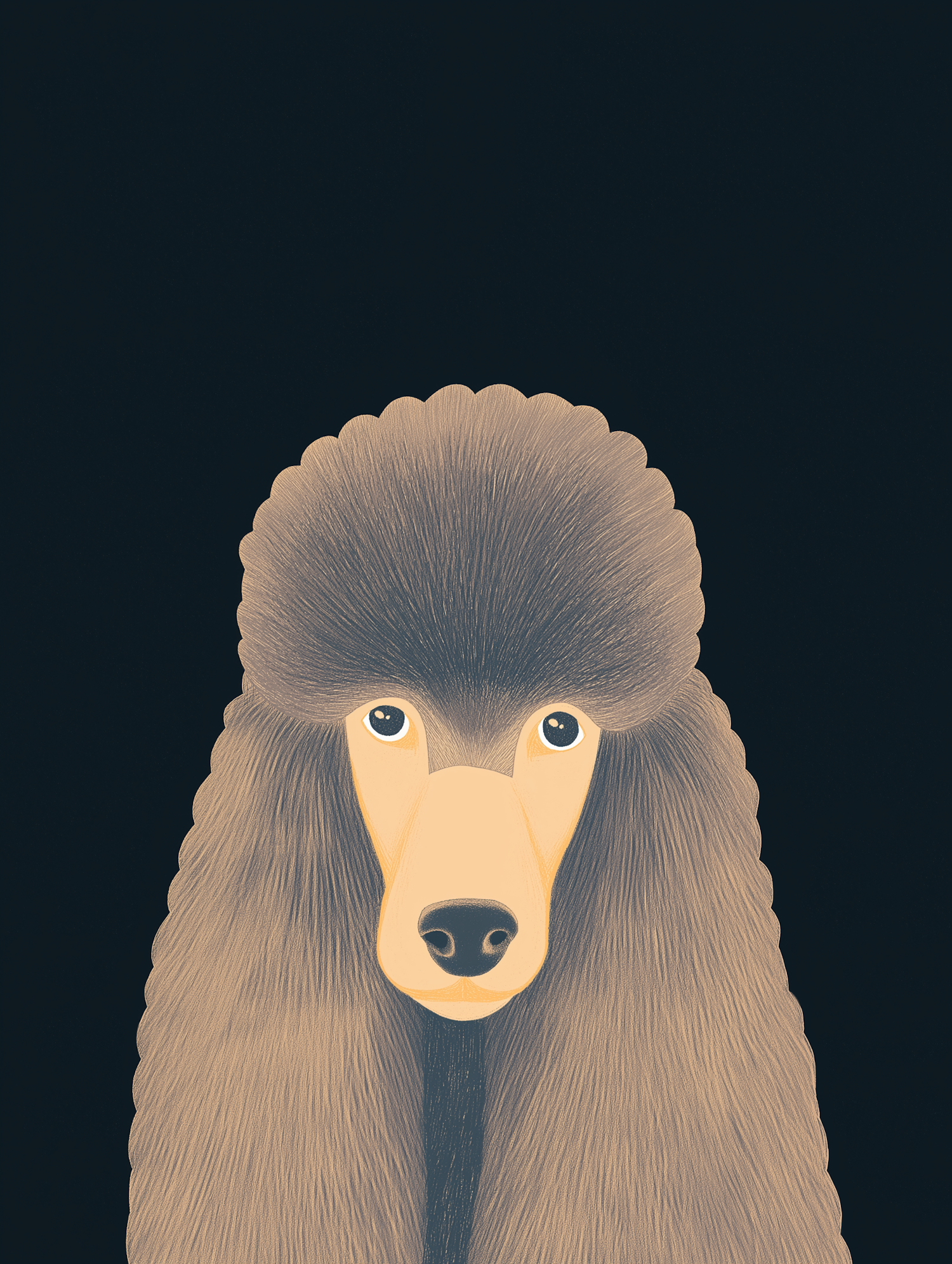 Stylized illustration of a chocolate standard poodle with detailed fur texture set against a dark, contrasty background.