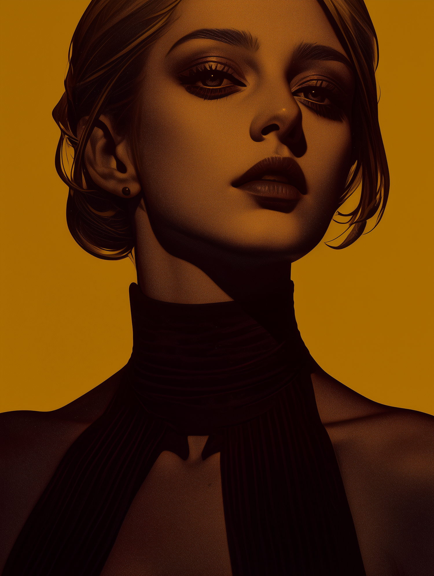 Dramatic portrait of a woman with bold makeup and elegant updo against a warm amber background, exuding sophistication and mystery.