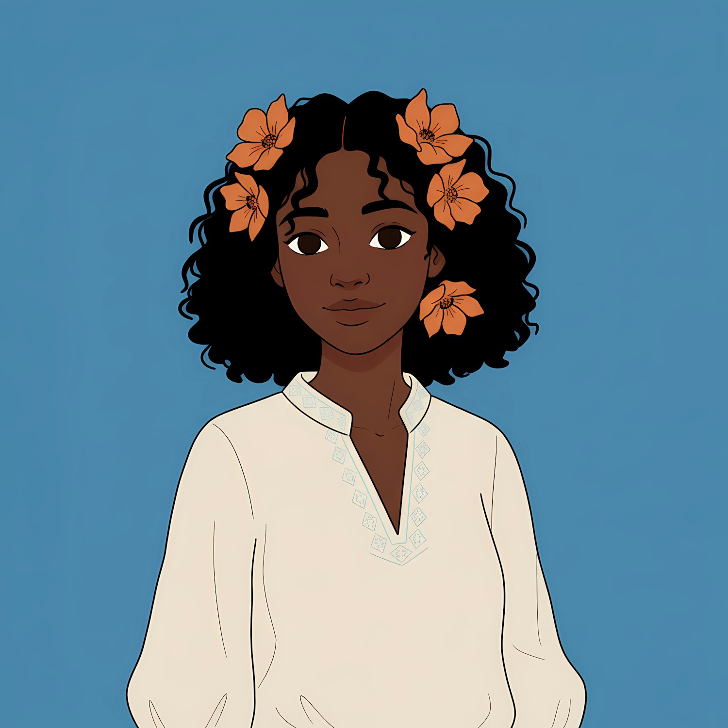 Illustration of a young woman with curly hair and orange flowers, wearing a white blouse against a blue background.