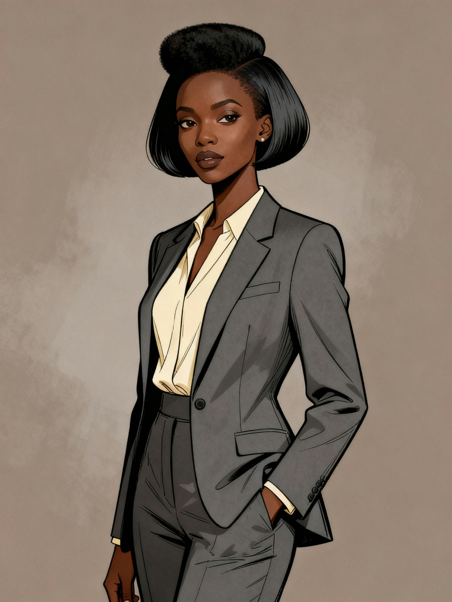 Cinematic portrait of a stylish Black female lawyer dressed in a tailored charcoal-gray suit with a cream blouse that flatters her skin tone. Her hair is styled in a trending short cut: a sleek tapered afro with a soft, sculpted silhouette that gives a modern, confident edge. She stands against a muted taupe background that enhances the outfit. Clean, diffused lighting brings out the texture of her hair, the sharp lines of the suit, and her poised, assertive expression. The mood is refined, contemporary, and undeniably commanding—high-fashion professionalism.