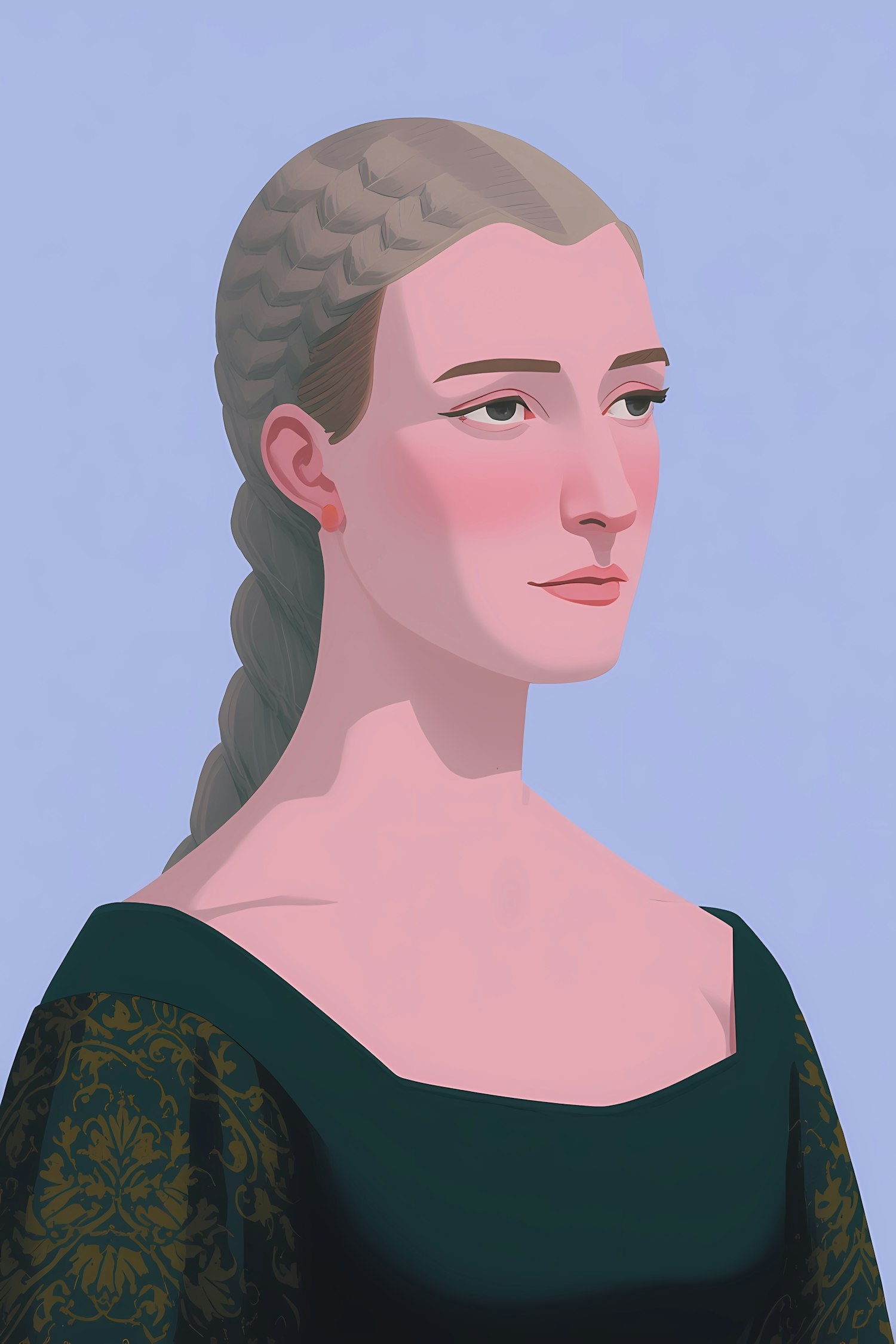 Stylized digital portrait of a woman with braided hair, wearing a patterned green dress against a light blue background.