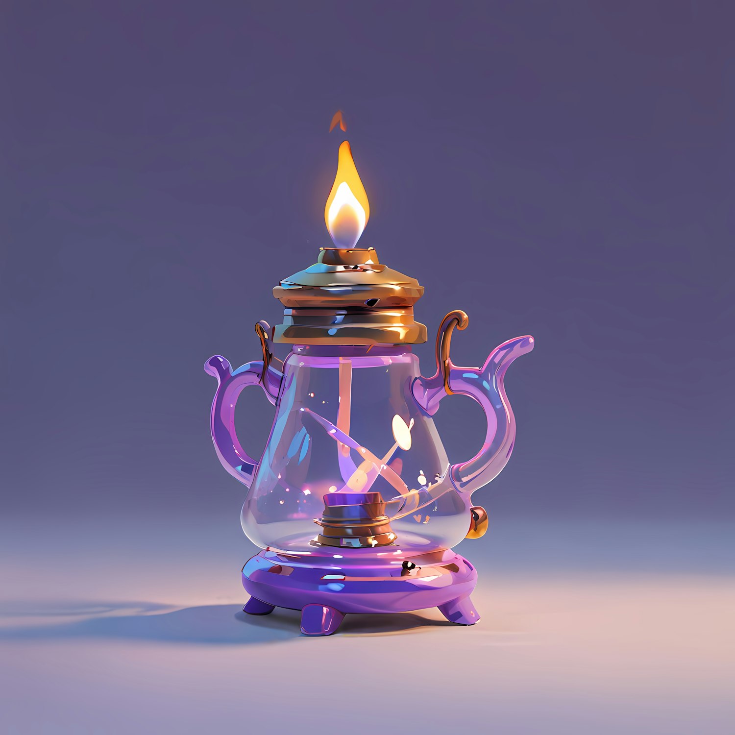 Whimsical 3D-rendered oil lamp with purple glass and golden accents, casting a warm glow in a mystical setting.