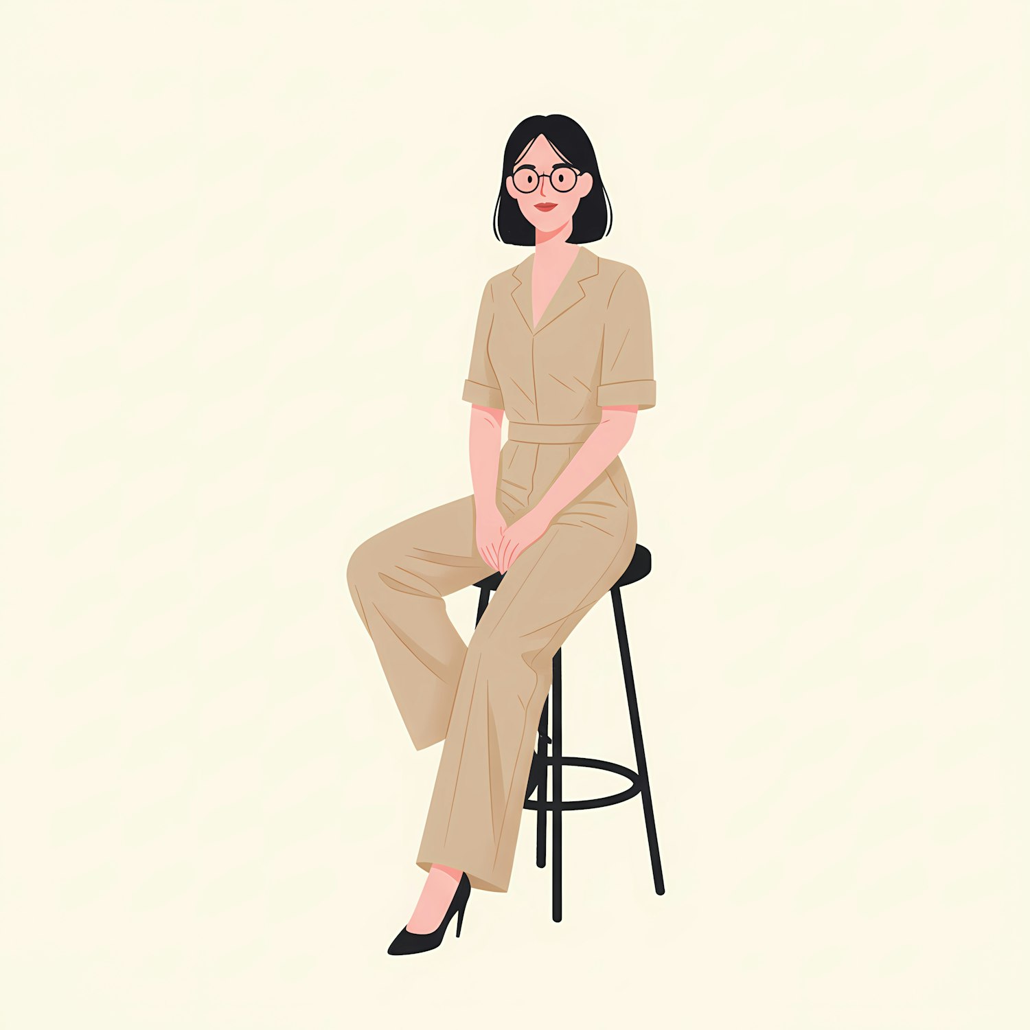 Illustration of a woman in a beige jumpsuit sitting on a stool, with a minimalist and neutral background.