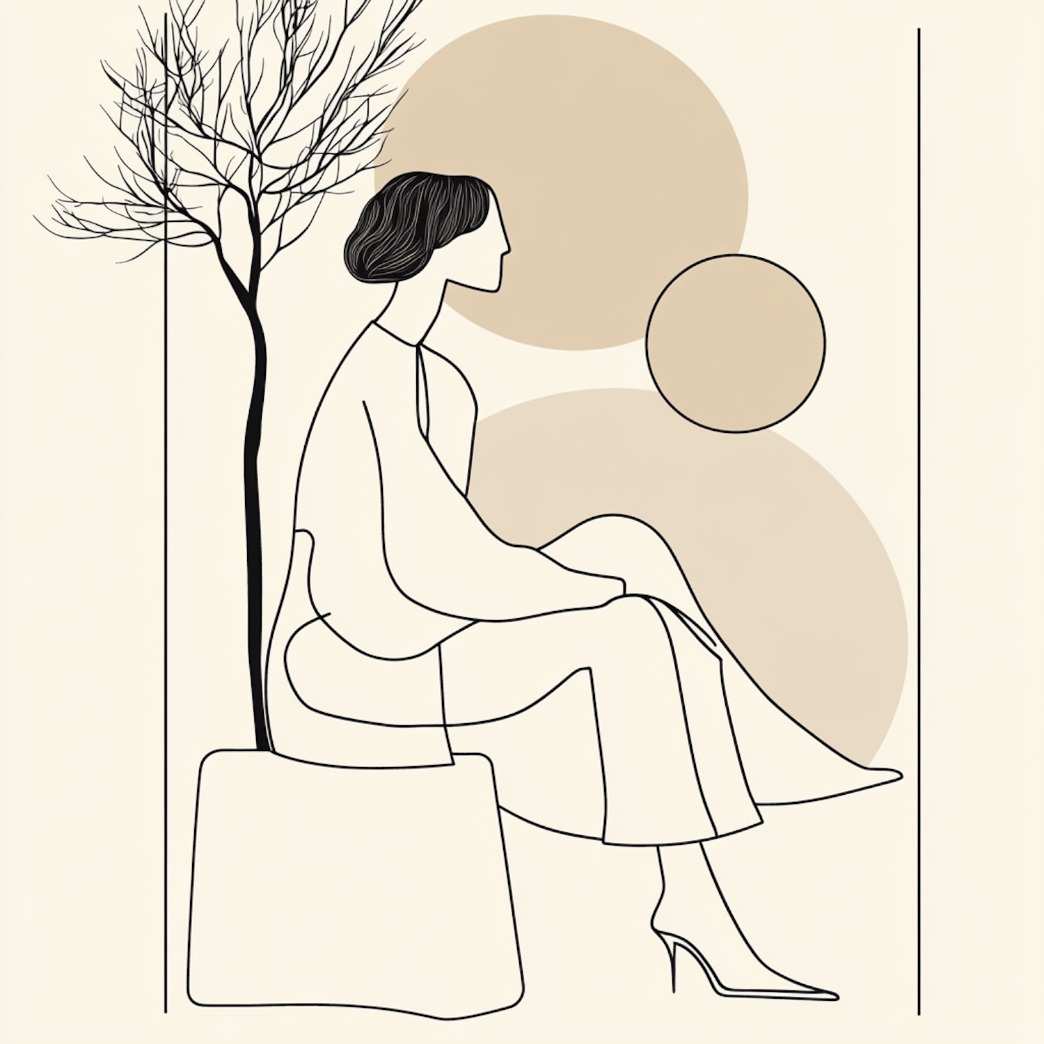 Minimalist line art of a woman sitting with a tree and abstract circles, featuring elegant lines and a neutral color palette.