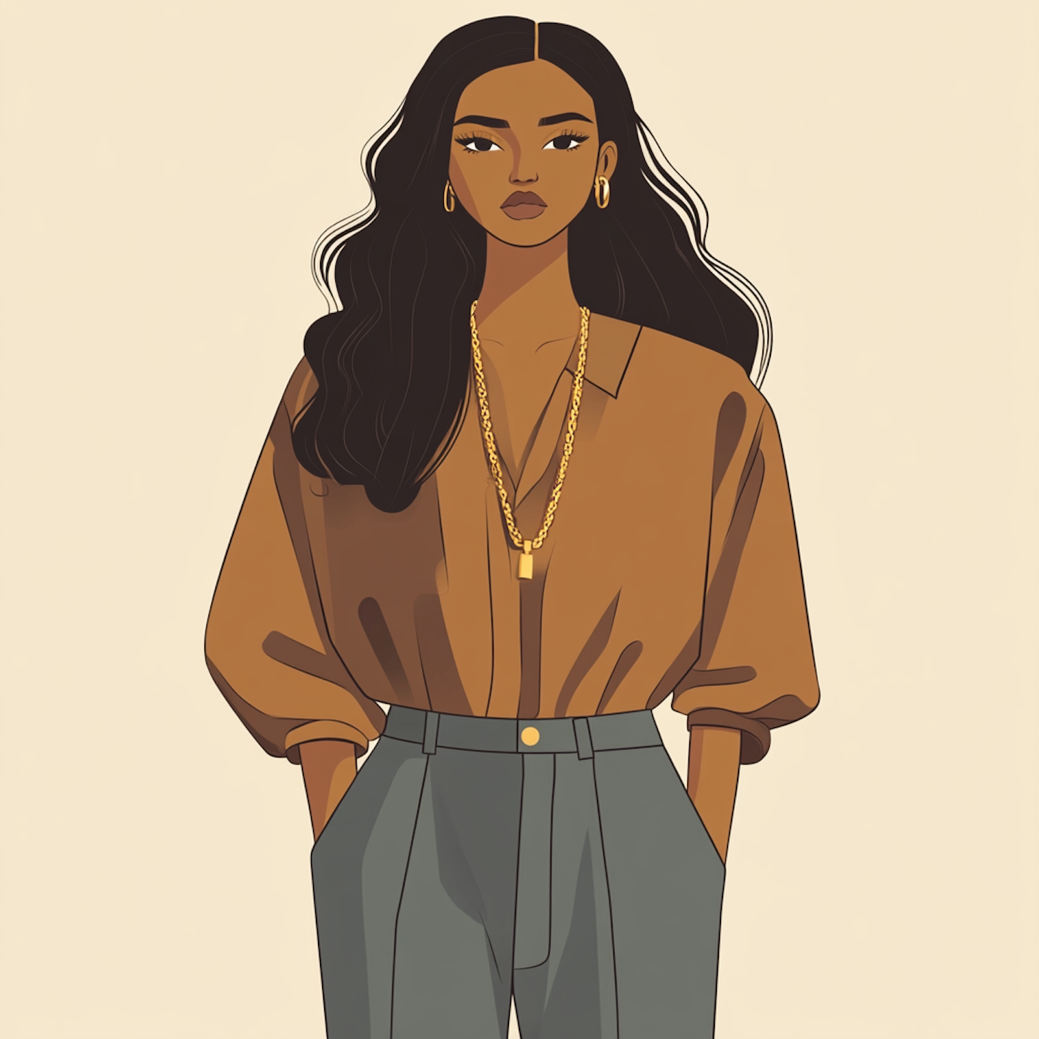 Stylish illustration of a woman with wavy black hair, brown blouse, gray trousers, gold accessories, and a confident expression.