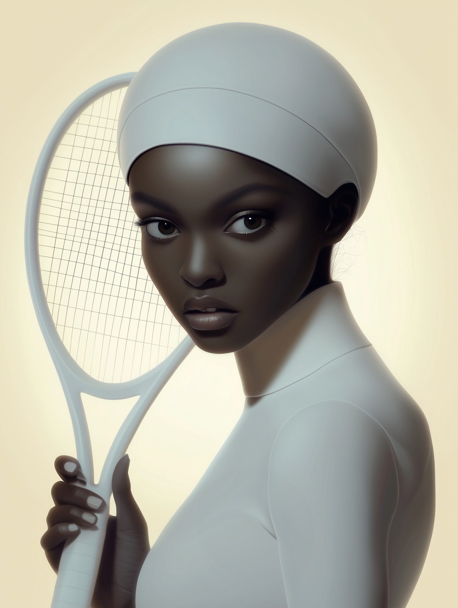 Elegant digital illustration of a Black woman holding a white tennis racket, wearing a sleek white outfit and head covering.