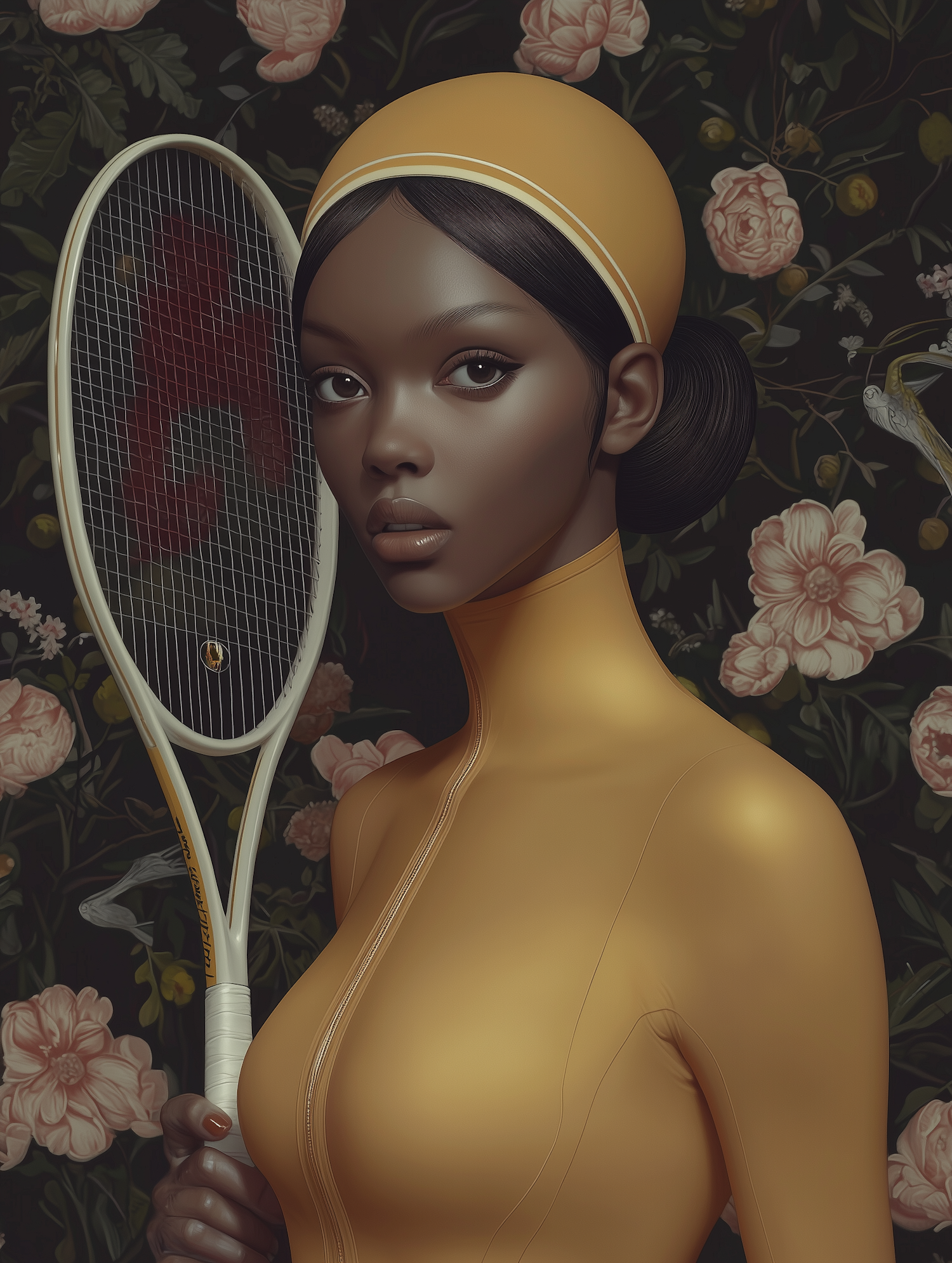 Elegant digital illustration of a woman in a mustard-yellow bodysuit holding a tennis racket, set against a dark floral background.