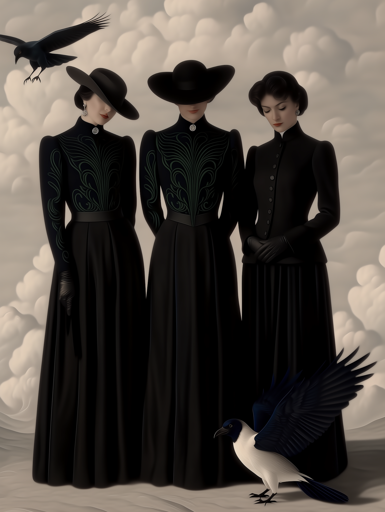 Three women in black dresses and hats stand with a crow and magpie, set against a cloudy sky, creating a mysterious and elegant scene.