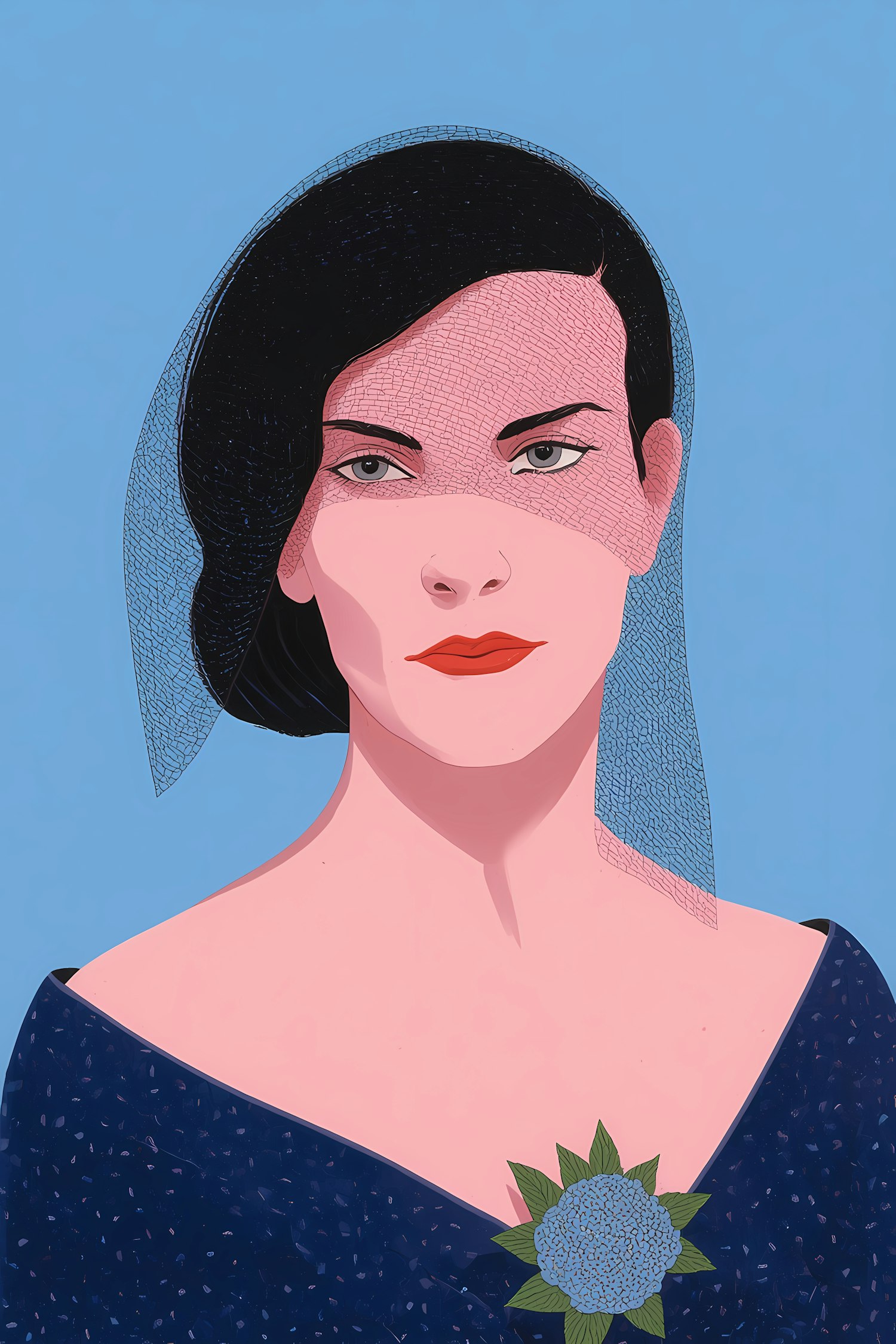 Stylized portrait of a woman with a black veil, dark blue dress, and a blue flower, set against a light blue background.