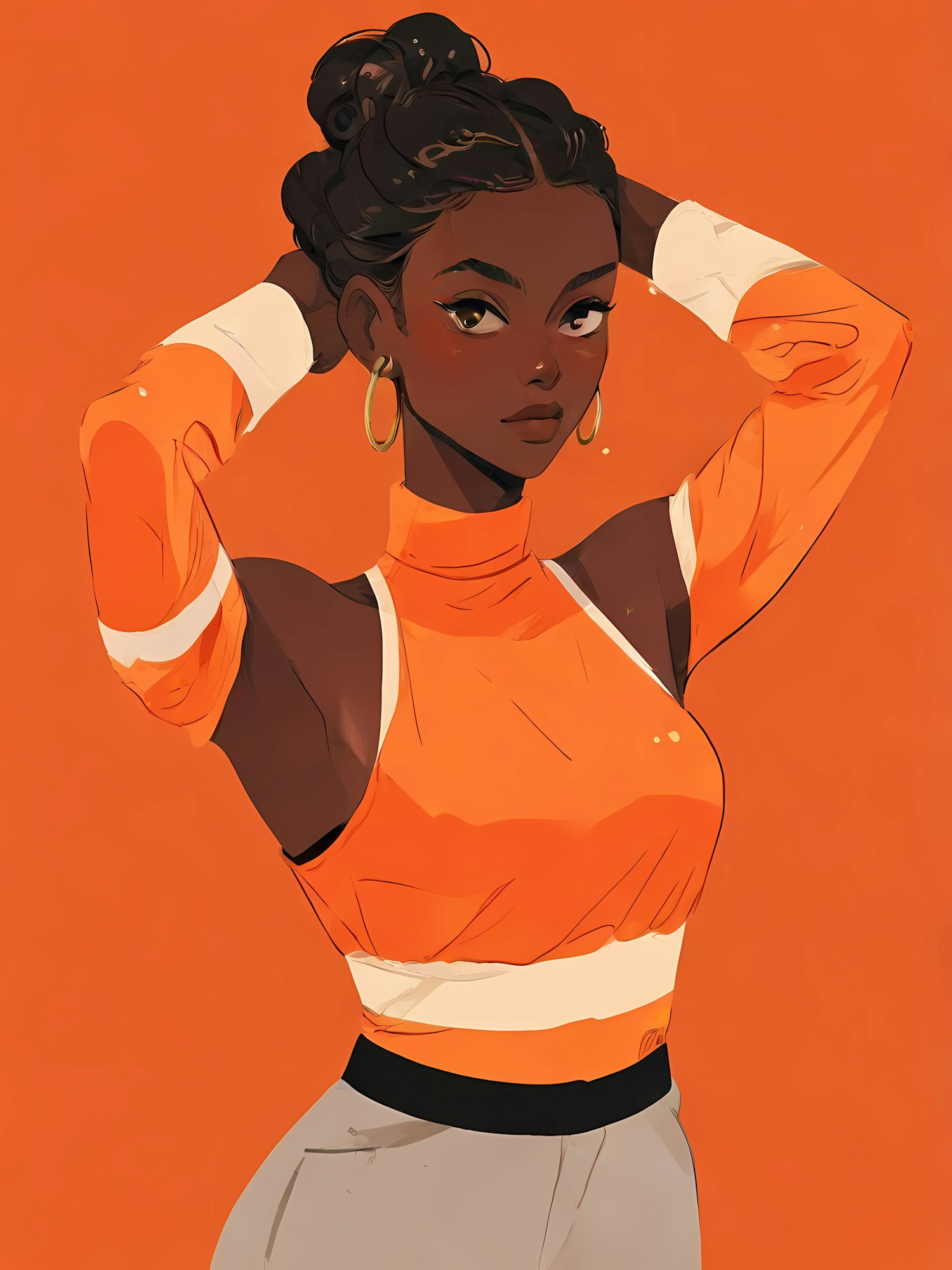 Stylish illustration of a woman with dark skin, hoop earrings, and an orange top against a warm orange background.