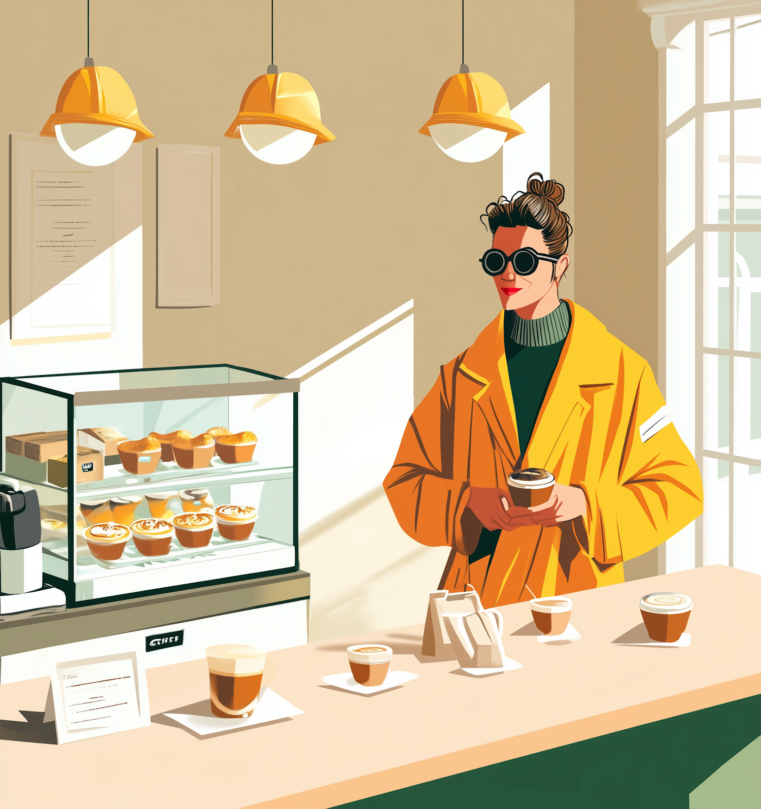 Chic café scene with a person in a yellow coat holding coffee, surrounded by pastries and warm lighting.