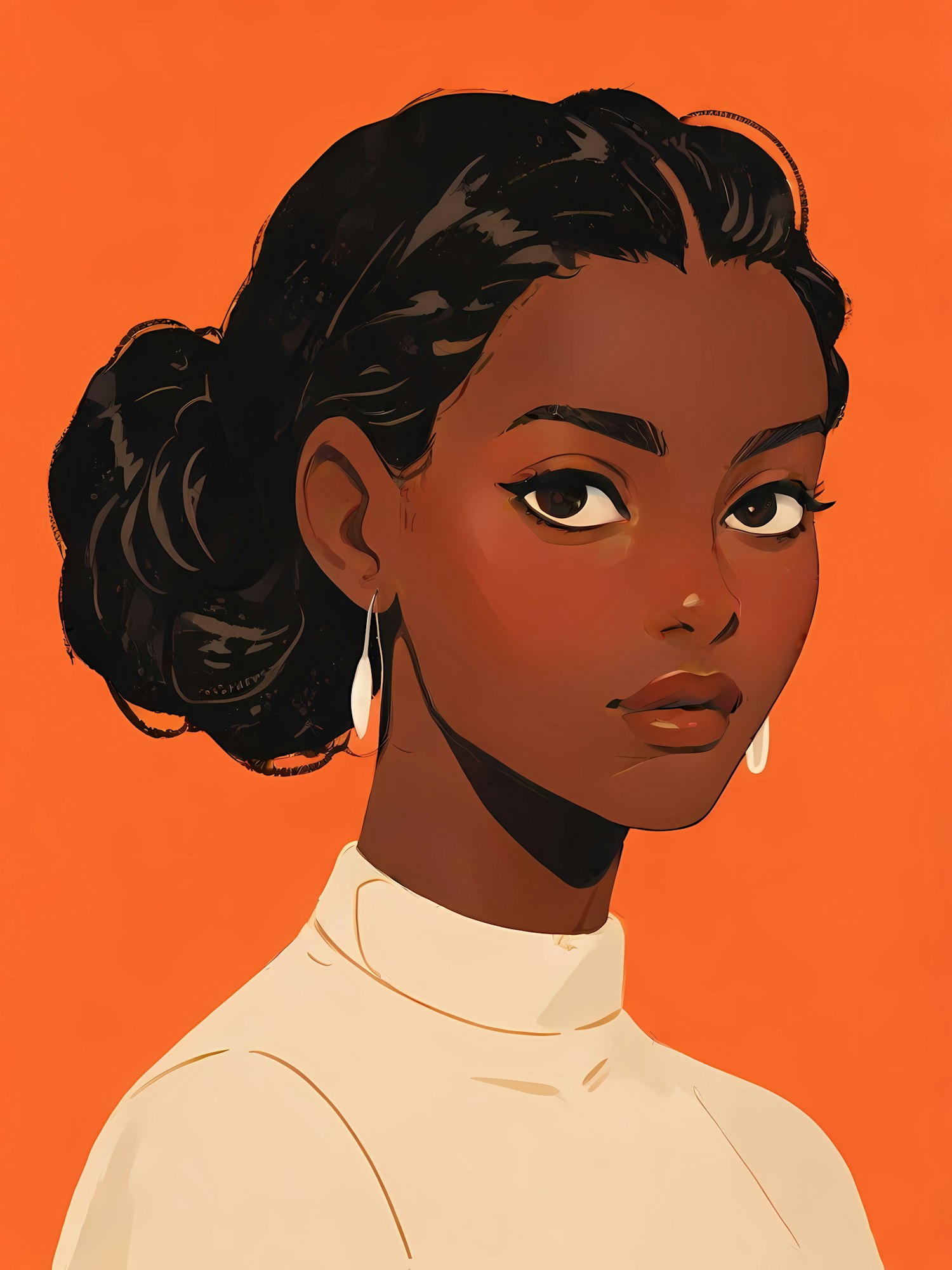 Stylish illustration of a young Black woman with an elegant updo and white top against a vibrant orange background.