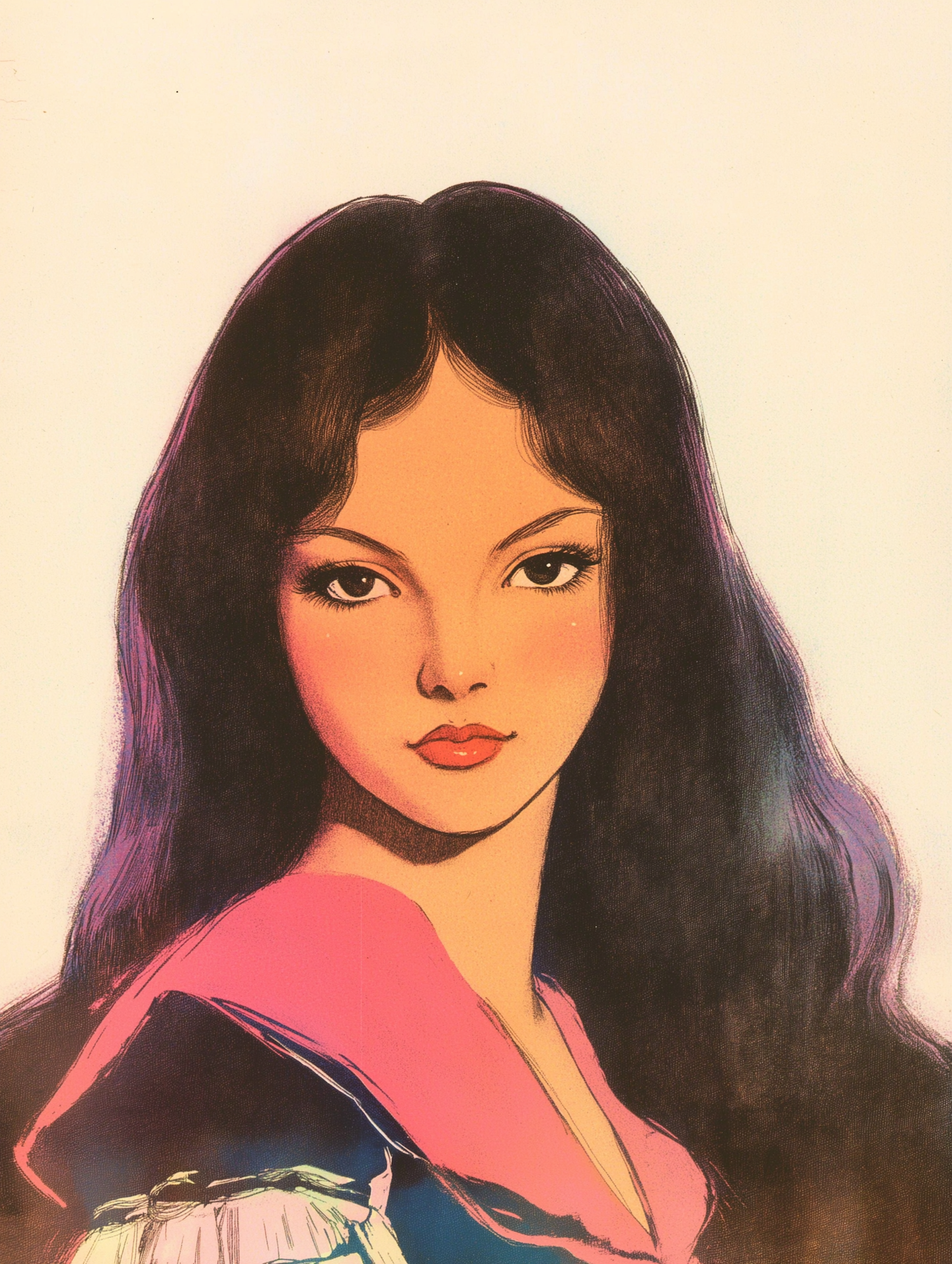 Elegant illustration of a woman with long black hair, expressive eyes, and a pink-collared garment, in a classic anime style.