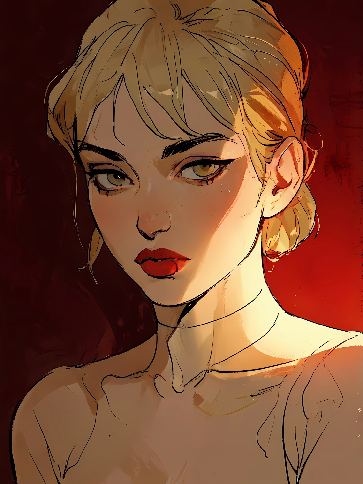Illustration of a blonde woman with amber eyes and red lipstick, set against a dramatic red background.