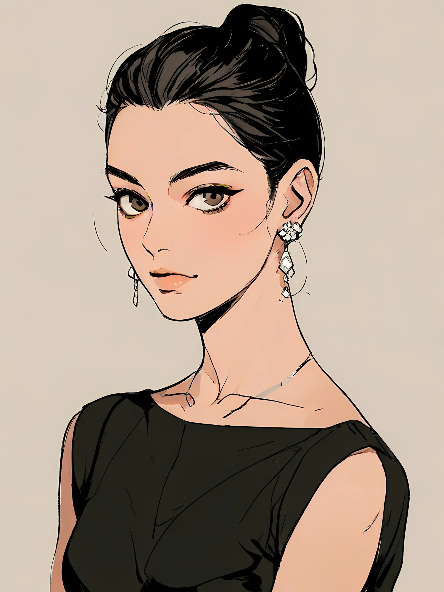 Elegant illustration of a woman with dark hair in a bun, wearing sparkling earrings and a black top, exuding sophistication.