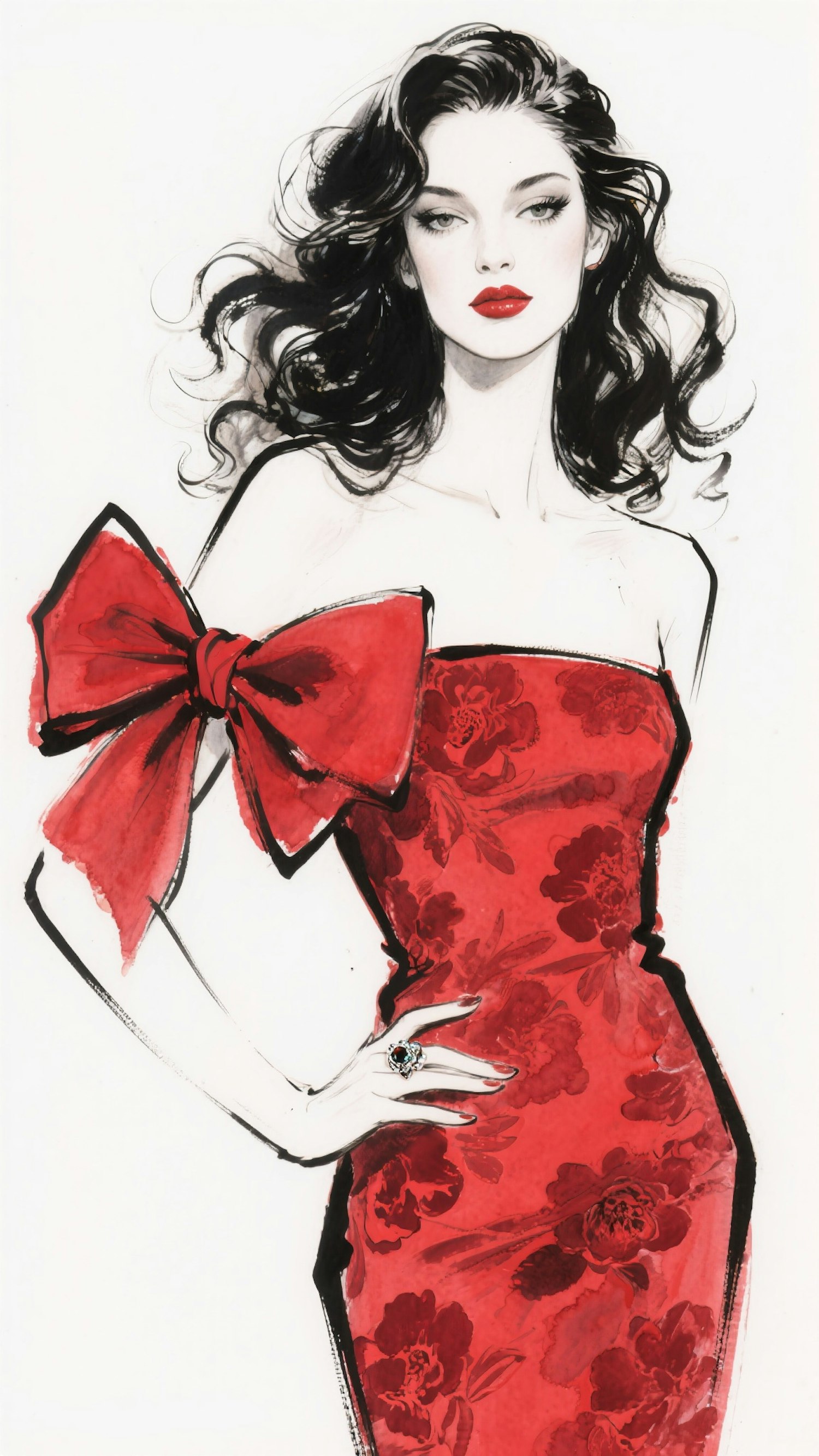 Stylized illustration of a woman in a red floral dress with a large bow, showcasing elegance and boldness with striking red lips and wavy hair.