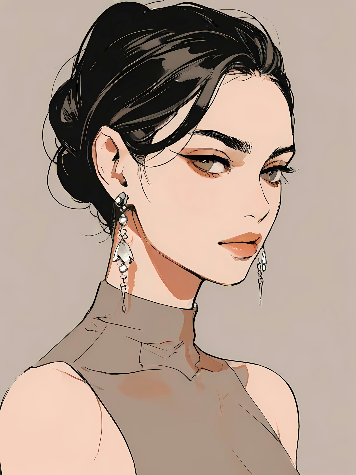 Elegant illustration of a woman with dark hair, wearing long earrings and a high-necked top, exuding sophistication and style.