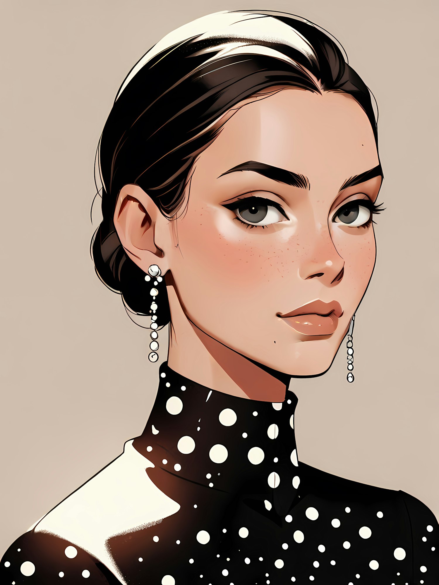 Elegant illustration of a woman with dark hair in a bun, wearing a polka dot dress and dangling earrings, set against a beige background.