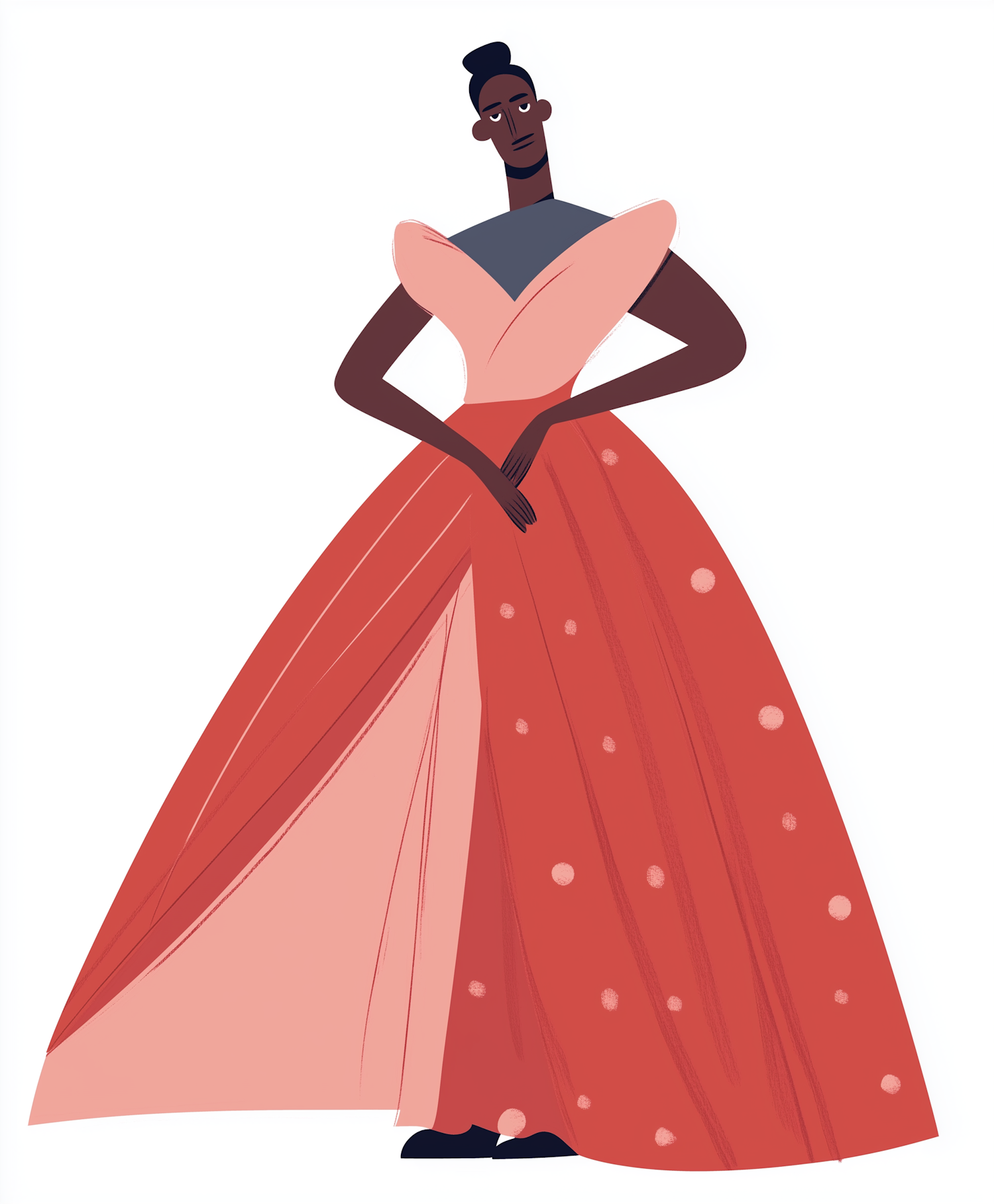 Stylized illustration of a person in a pink and red gown with polka dots, set against a white background.