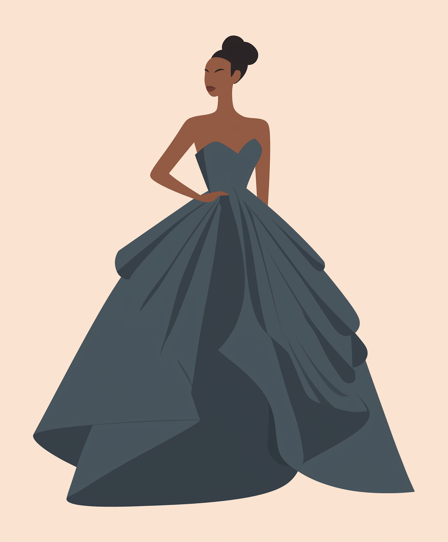 Elegant illustration of a woman in a dark blue gown with a voluminous skirt, styled hair, and a confident pose against a beige background.