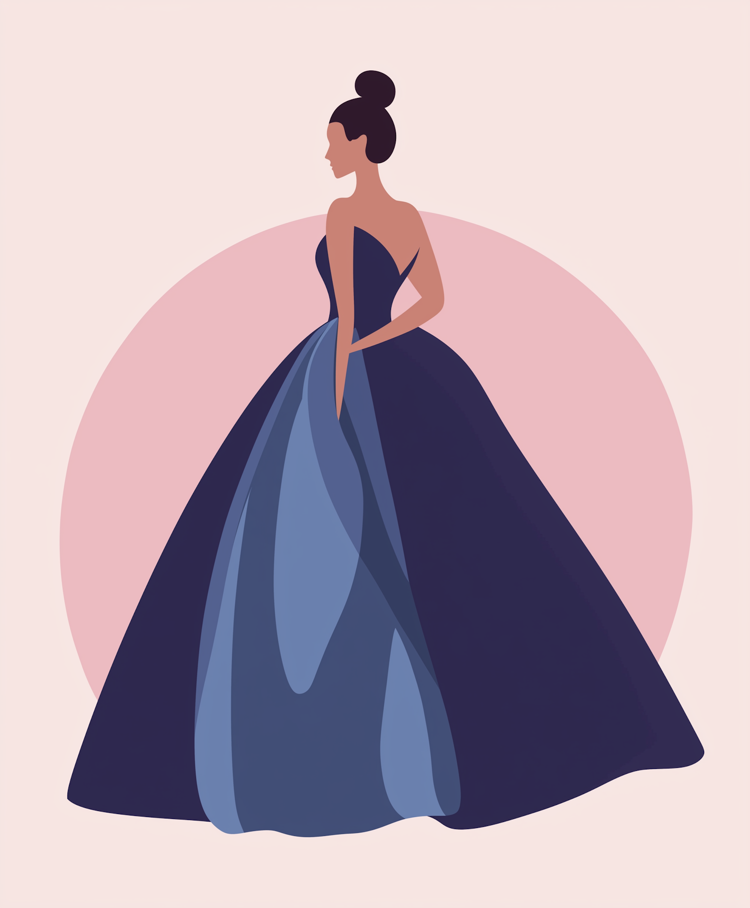 Elegant illustration of a woman in a navy blue gown with a pink background, showcasing minimalist style and graceful design.