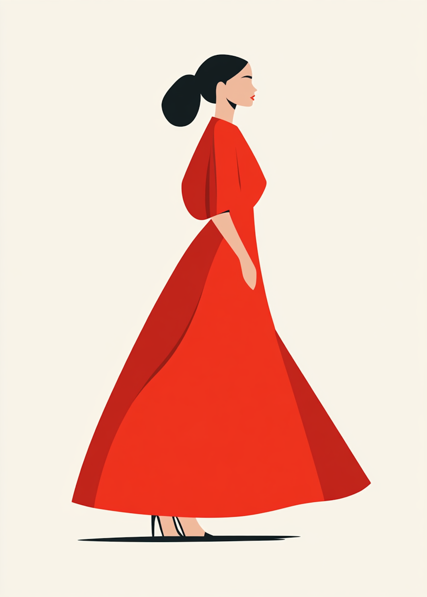 Stylized illustration of a woman in a flowing red dress, with a minimalist design and elegant pose.