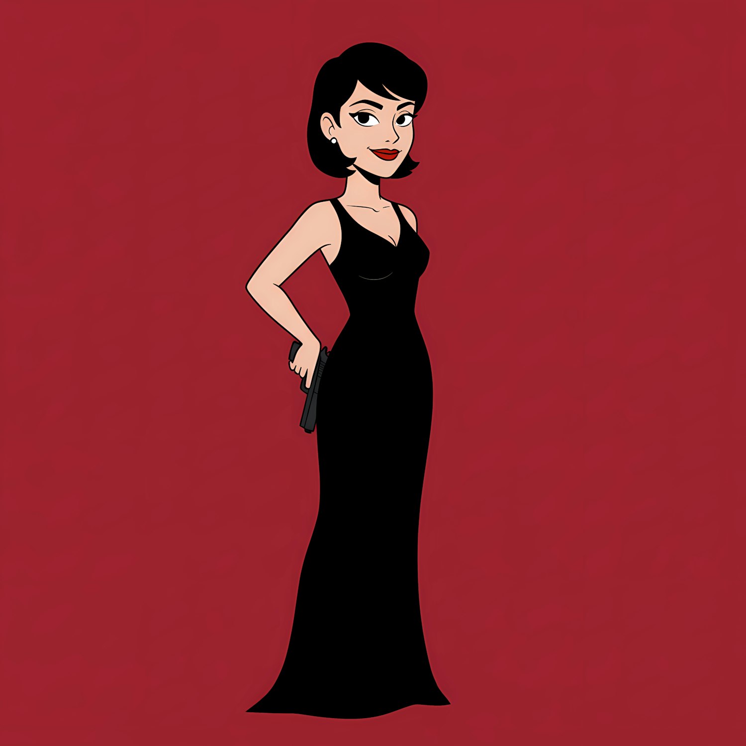 Stylized illustration of a woman in a black evening gown against a red background, holding an object behind her back.