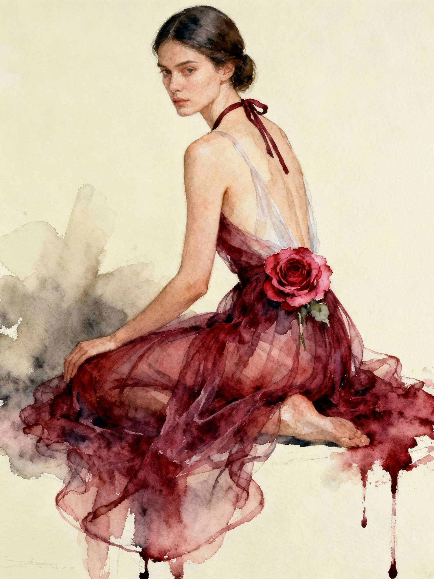 A delicate watercolor painting of a woman posed in profile, kneeling gracefully against a soft cream background. She wears an ethereal burgundy dress painted in translucent washes of red and wine tones. The fabric is suggested through layered brushstrokes of sheer watercolor, flowing into ruffled textures with a loose, expressive quality. A large rose blooms on her hip, rendered in deeper crimson hues with soft gradients and petal details that bleed gently into the paper. The bodice is airy and minimal, with light strokes fading into the skin tone, suggesting a backless halter tied at the neck. Her hair is pulled back smoothly, painted with darker, controlled strokes, while her face is defined with fine lines and subtle shading, giving a calm yet intense gaze. Shadows are created with muted washes, blending seamlessly into the background, allowing the burgundy tones to dominate. The overall effect is fluid, soft, and dreamlike, emphasizing movement, elegance, and the interplay of light through transparent fabric.