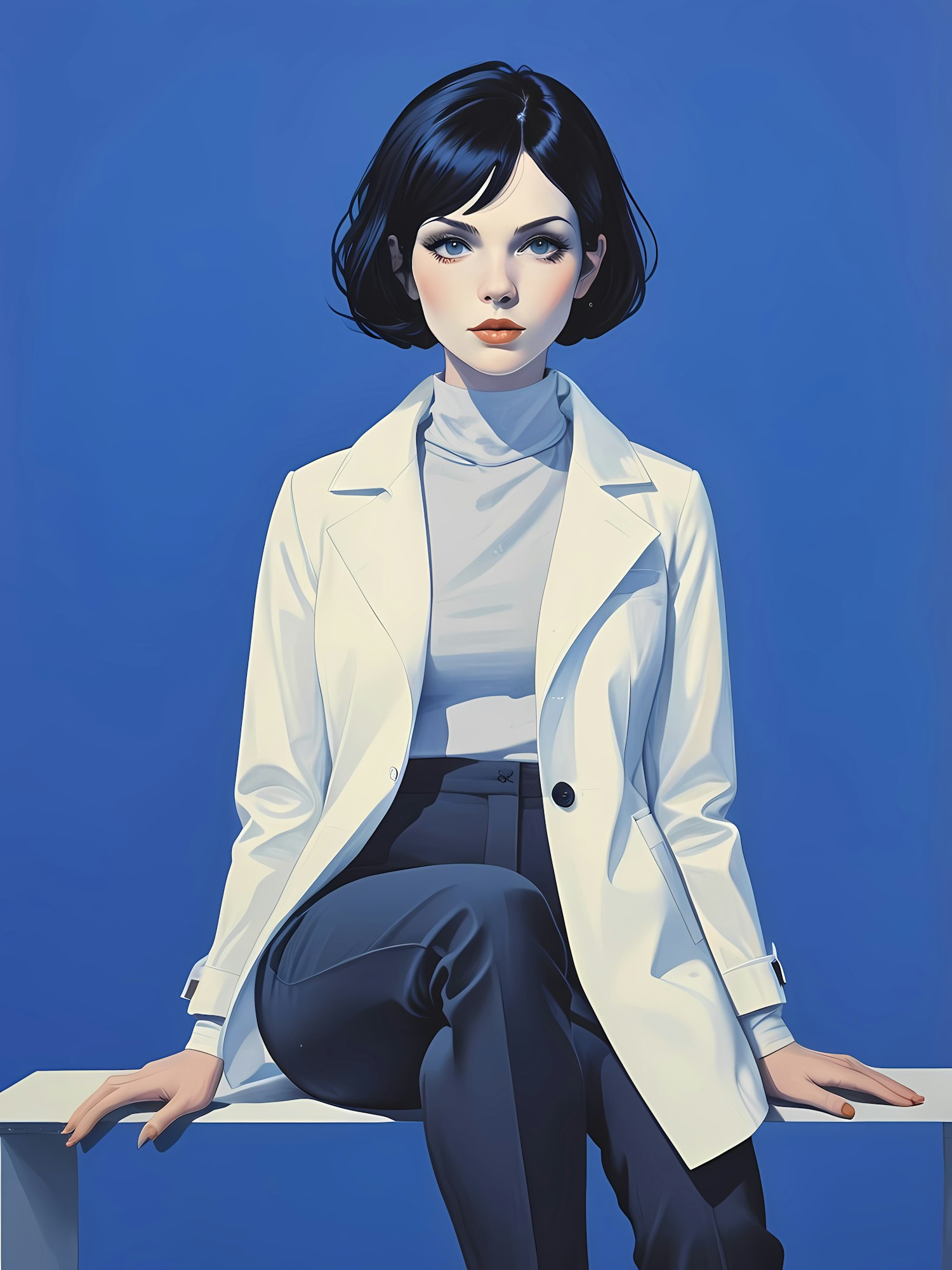 Stylish woman with short black hair in a white blazer and dark trousers against a blue background, exuding elegance and confidence.