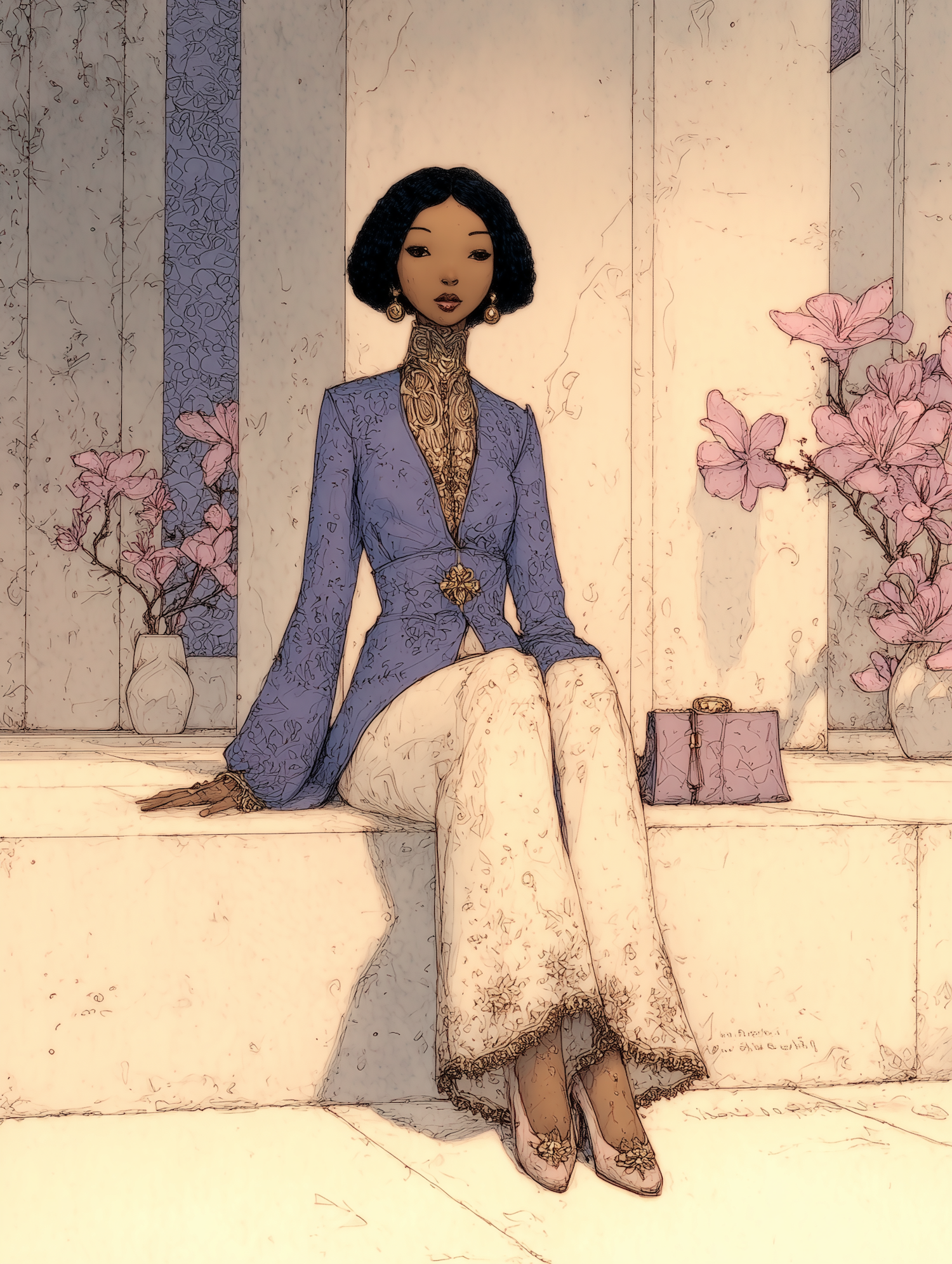 Stylized illustration of a poised woman in elegant attire, seated amidst blooming flowers and architectural elements.